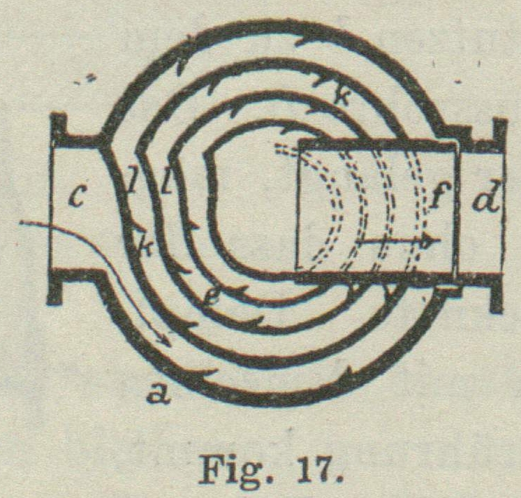 mitführt, wird bei der ersten Richtungsänderung nach seinem Eintritt bei a durch Centrifugalkraft an die Innenwand des