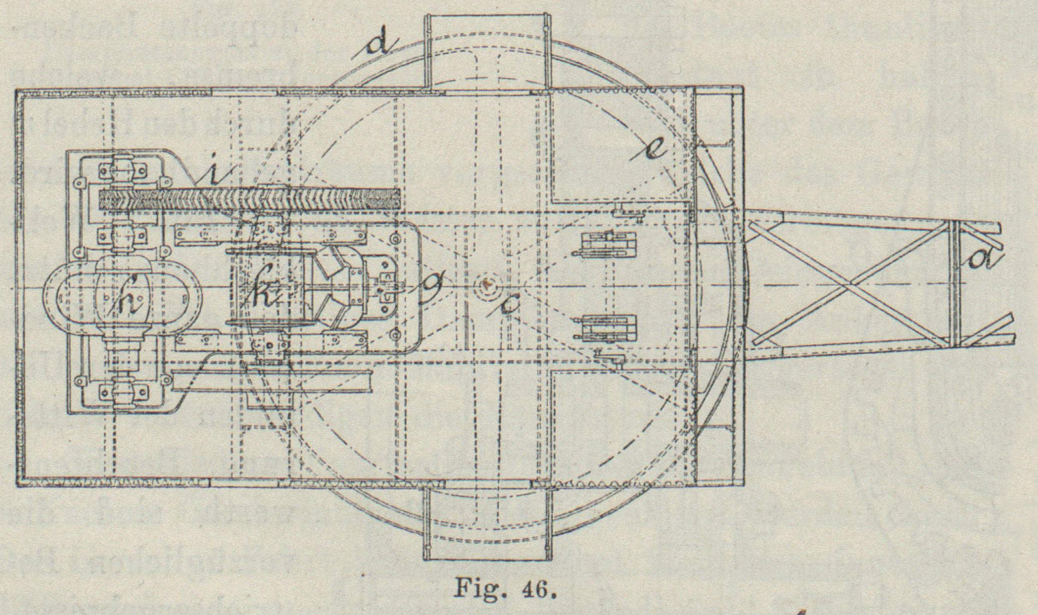 Diese Ringbahn ist auf dem Brückenwerk befestigt und trägt einen Zahnkranz e, in welchen ein auf stehender Welle sitzendes
