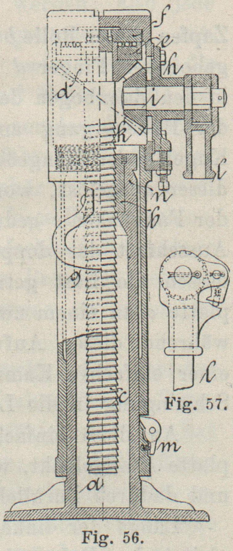 Säulenfuss a mit fest eingesetzter Spindelmutter b, deren Schraubenspindel c Trapezgewinde von 6 mm Steigung und 40 mm Durchmesser besitzt.
