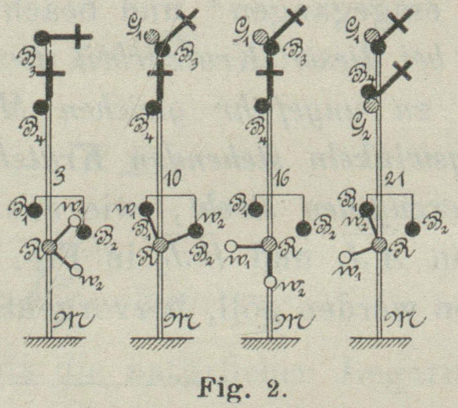 und erscheinen daselbst die weissen Laternen mit w1 und w2, deren Blenden mit B1 und B2, die grünen Laternen mit G1 und G2, deren Blenden mit B3 und B4, sowie schliesslich die rothe Signallampe mit R bezeichnet. Daraus können im Zusammenhalt mit Fig. 1 überhaupt alle
