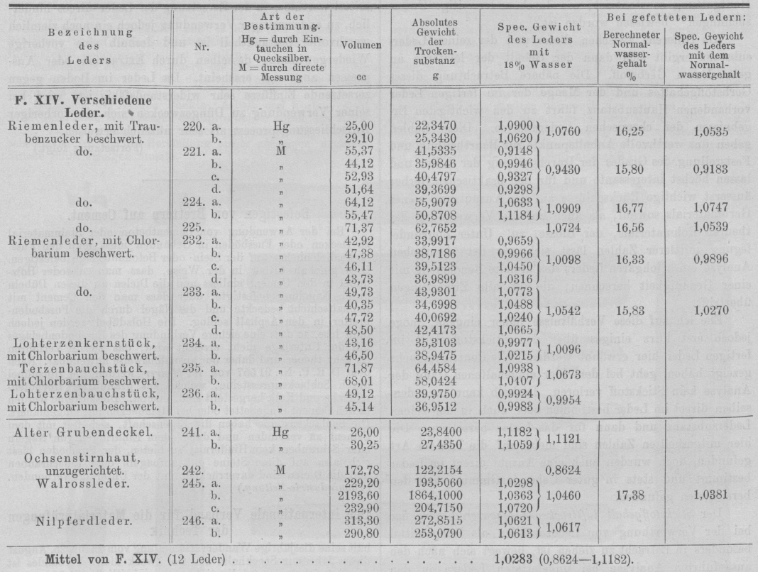 Gewicht des Leders mit dem Normalwassergehalt; F. XIV. Verschiedene Leder.;