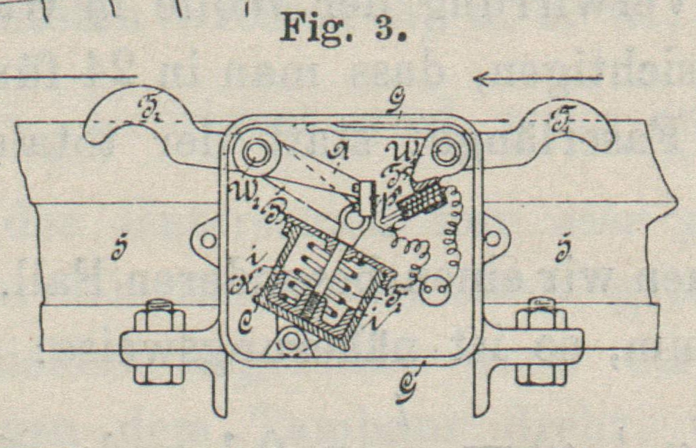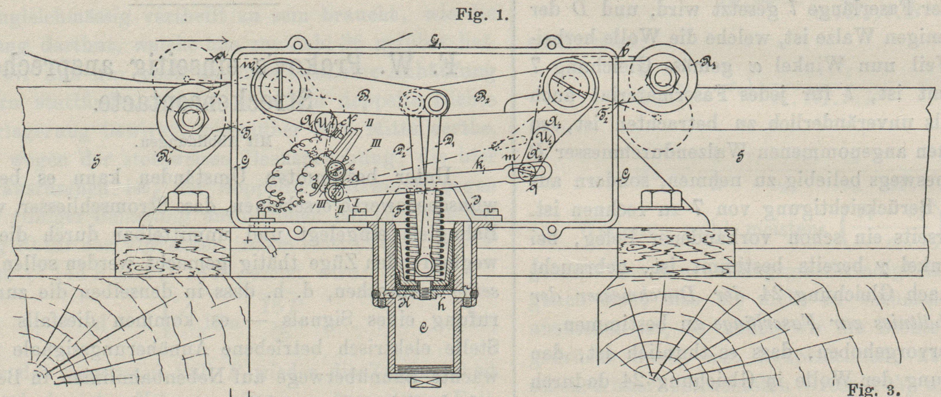 8 auf den Oberbauschwellen ein eisernes Gehäuse GG festgeschraubt, aus welchen zwei an der Welle W1 bezieh. W2 drehbare, an ihren