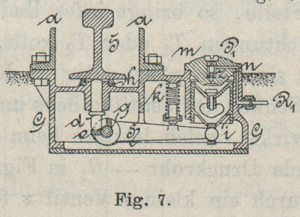hiergegen vermöge des Einflusses seiner Rückstellfeder F allerdings von jedem Rade des vorbeifahrenden Zuges neuerlich