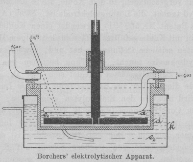 Elektrotechnik.Fortschritte der angewandten Elektrochemie. Von Dr. Franz Peters. Mit Abbildung. Fortschritte der angewandten Elektrochemie. A. Stromquellen. Auf dem Gebiete der Stromerzeugung bewegte sich die Erfinderthätigkeit in dem Zeitraume der Berichterstattung wesentlich auf Bahnen, die zu einer, meist mechanischen Vervollkommnung im Principe bekannter Ketten führen sollten. Bei den Primärelementen sind am meisten beachtenswerth die Bemühungen zur Erzielung einer vollkommeneren Depolarisation. Den Gasketten ist erhöhte Aufmerksamkeit zugewendet worden. Das Studium des Problems der directen Elektricitätserzeugung aus Kohle hält an, hat aber zu einem einigermaassen brauchbaren technischen Resultat noch nicht geführt. In der Accumulatorentechnik ist das Hauptbestreben auf Erhöhung der Haltbarkeit der positiven Platten gerichtet. Der Zinksammler hat mehrere Erfinder beschäftigt. Ob die Neuerungen wirklich Verbesserungen sind und ihn lebensfähig machen, bleibt abzuwarten. I. Primärelemente. a) Gewöhnliche galvanische Elemente. Der beim Schliessen des Stromes eintretende schnelle Abfall der elektromotorischen Kraft eines galvanischen Elements rührt nach B. E. Moore und H. V. Carpenter (Phys. Revue, 1897 Bd. 4 S. 329) hauptsächlich von der Polarisation an der Kohleelektrode, das schnelle Ansteigen beim Oeffnen des Stromes von der Erholung der Zinkelektrode von der Polarisation her. Doe beschreibt (Amerikanisches Patent Nr. 576095) eine aus Zink-Kohle-Elementen bestehende Batterie, W. Turner (Englisches Patent Nr. 1669/1896) eine Circulationsbatterie. E. S. Boynton (Amerikanisches Patent Nr. 563127) setzt mehrere Elemente, die Röhren am Boden haben, über einen gemeinschaftlichen Trog, der leichte Füllung mit dem Elektrolyten und Entleerung gestattet. In die nichtleitenden Gefässe der einzelnen Elemente sind die Kohleelektroden fest eingesetzt, während die Zinkelektroden an einem gemeinschaftlichen Bügel befestigt sind. Eine besonders zum Beleuchten von Fahrrädern u.s.w. verwendbare Batterie aus drei Zink-Kohle-Elementen geben Th. T. Boland, Ch. J. und H. Ch. Hubbell an (Englisches Patent Nr. 20077/1896). C. N. Sedneff (Englisches Patent Nr. 17026/1897) beschreibt ein Zink-Kohle-Element, in dem der Sauerstoff des Depolarisators regenerirt wird und das Diaphragma nur für Wasser und Gase durchlässig ist. In Zink- oder Eisen-Kohle-Elementen mit Salmiak oder Natronsalpeter als Erregerflüssigkeit bringt W. Rowbotham (Englisches Patent Nr. 16268/1896) eine Kammer für den aus 1 Th. Schwefelsäure vom spec. Gew. 1,79 und 1 bis 6 Th. Salpetersäure vom spec. Gew. 1,48 bestehenden Elektrolyten und einen Ausdehnungsraum an. Beim Arbeiten des hermetisch verschlossenen Elementes wird der Depolarisator von den entwickelten Gasen in die Ausdehnungskammer gedrückt und gelangt von hier in die röhrenförmigen, von porösen Rohren umgebenen Kohleelektroden. Auf die Elemente von Brewer (Amerikanisches Patent Nr. 576720), Badt (Amerikanisches Patent Nr. 576936) und Burnet (Amerikanisches Patent Nr. 577282) sei verwiesen. D. Mathieu (Englisches Patent Nr. 20035/1896) verwendet an Stelle der porösen Thoncylinder in Leclanché-Elementen einen aus Kohlestäben und -scheiben zusammengesetzten Behälter. V. Jeanty (Englisches Patent Nr. 12827 von 1897) will dadurch ohne poröse Scheidewand auskommen, dass er die Elektroden wagerecht stellt und die Depolarisationsflüssigkeit und den Depolarisator an den Boden des Gefässes bringt. Von dieser Art der Trennung der Flüssigkeiten und des Depolarisators hat man schon früher Gebrauch gemacht. Um ohne Vergrösserung des Raumes bei Primärelementen möglichst grosse Elektrodenflächen anwenden zu können, lassen C. Shrewsbury und F. Marshall (Englisches Patent Nr. 20843/1895) das Zink, das die hohle Kohle umgibt, auch in deren Inneres hineinragen. Die Kohle steht in dem ringförmigen Raume zwischen den doppelten Wänden eines porösen Thoncylinders. Aus demselben Grunde versieht K. W. Hertel (Elektrochem. Zeitschr., 1897 Bd. 4 S. 174) die Kohleelektrode mit Hohlräumen, die mit durchbrochenen Kupferhülsen ausgefüttert sind. Mit letzteren stehen kupferne Ableiter, die unter einander verbunden und mit depolarisirenden Stoffen umgeben sein können, in leitender Verbindung. Ein geschlossenes Element des Leclanché-Typus mit Magnesiumammoniumchlorid als Elektrolyten und Cellulose zwischen den oder um die Elektroden beschreiben R. M. J. Heurtey und P. Germain (Englisches Patent Nr. 16597/1896). In galvanischen Elementen aus Amalgam (z.B. des Zinks), einem von einem hohen Oxyd des Bleies umgebenen Metallstab und verdünnter Schwefelsäure hüllt J. Kitsée (Englisches Patent Nr. 14508/1897) die Elektroden in ein widerstandsfähiges poröses Material, wie Holz oder Stuck, ein. Caesar Vogt (D. R. P. Nr. 89922) setzt auf den Zinkcylinder flache federnde Isolirklammern mit Nasen, die unten nach innen vorspringen, als Stützen für die Ableitungselektrode. Die vortheilhafte Befestigung der Elektroden bei tragbaren galvanischen Batterien beschreibt William Morison (D. R. P. Nr. 91049). Als Mittel zur Verhütung der Verdunstung des Elektrolyten empfiehlt die Chemische Fabrik Busse das Calciumoxychlorid (? oder nur Chlorid) unter dem Namen Calcidum. Es soll auch die Leitfähigkeit der Salmiaklösung verbessern und die Polarisation bis auf eine Wenigkeit herabdrücken. Die Lösung gefriert auch bei –30° nicht. Die Verwendung von Calciumchlorid zu dem erstgenannten Zwecke ist schon alt. Ferricyankalium will G. Platner (Elektrochem. Zeitschr., 1897 Bd. 3 S. 265) in Primär- und Secundärelementen als Elektrolyten gebrauchen. Das durch Einwirkung des Zinks gebildete Kaliumhydroxyd wird durch Turnbull's Blau unschädlich gemacht, der polarisirende Wasserstoff durch Kaliumchlorat oxydirt. Die Spannung beträgt 1,6 Volt. Das in ausgebrauchten Batterieelektrolyten in alkalischer Lösung enthaltene Zink fällen W. Walker jr., F. B. Wilkins, Jabez und Joseph Lones
