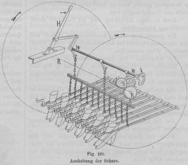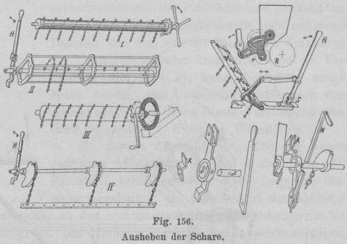 Maschinen, besonders wenn die Scharhebel an eine gemeinschaftliche Schiene K (Fig. 159) gehängt