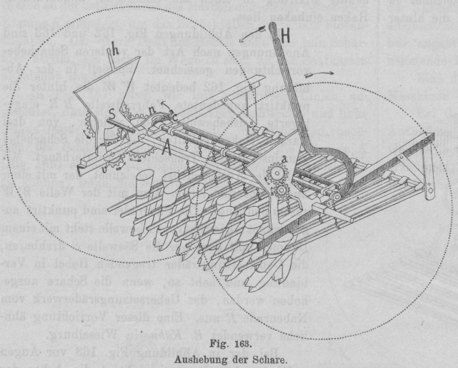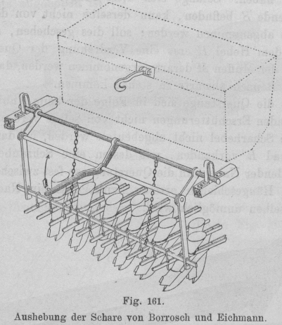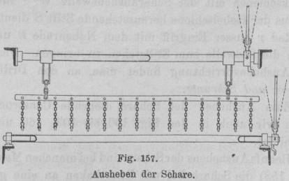 Behufs Aushebens der Schare sind bei manchen Maschinen (Fig. 158) die Scharhebel mit Drahthaken an eine gemeinschaftliche