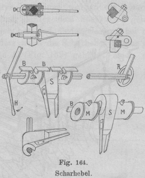 man die Scharhebelenden mit Klammern an der Querschiene befestigt (Fig. 164).