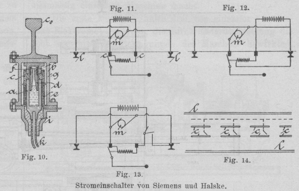 bewegliche Stromschlusstheile l2 und p, w14 nach der Hauptzuleitung fw. Dieser durch die mittlere Spule von geringem Widerstände am Magneten