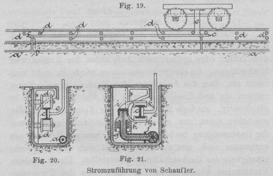 als diejenige zwischen letzteren und den Stromabgabevorrichtungen b, sowie den Leitrollen d.