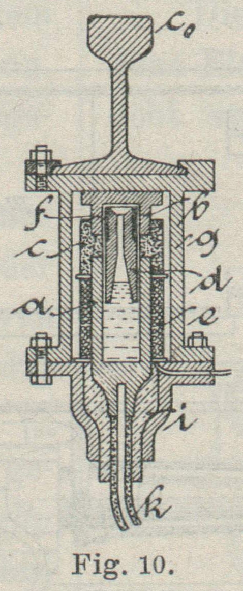 Die Gestaltung des zur Verwendung gelangenden Eisenkerns d ist vorteilhaft diejenige eines Cylinders, welcher, wie in Fig. 10 dargestellt ist,