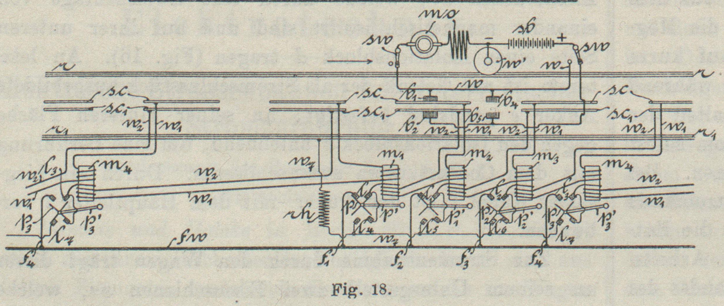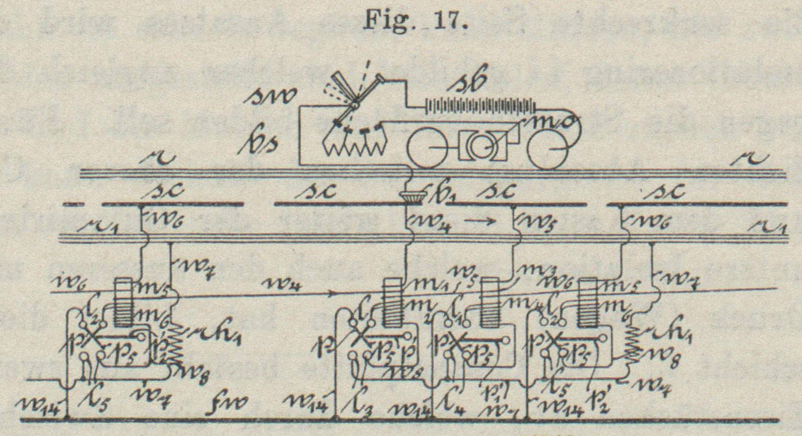 Gleisschiene zur Erde. Zugleich wird ein zweiter Stromkreis geschlossen: m1, w2, sc1, b2, w, sw sb und w0. Inzwischen sind die Ankerhebel p und p1 vorbewegt und dadurch die für gewöhnlich