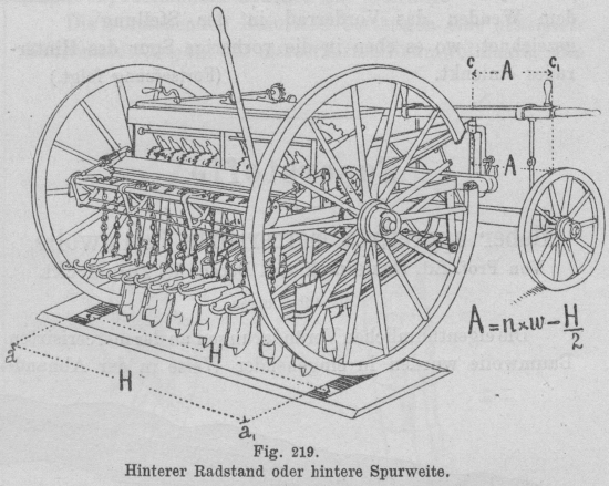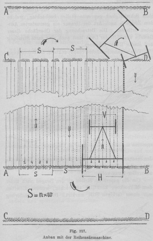 Summe das 2fache des Abstandes zwischen äusserster Schar und Hinterrad (2 e) abziehen, mit Buchstaben ausgedrückt: V = n × w + w – 2e. Es ist somit die Entfernung A (Fig. 216 und 222) des Vorderrades