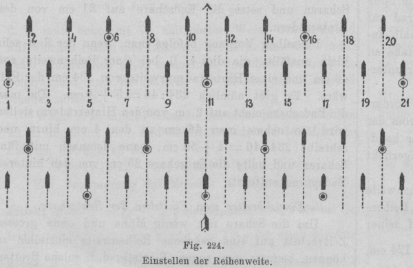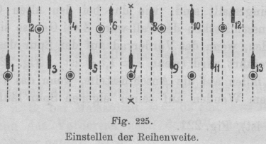 5-, 6- und 9fache der engsten Reihenweite einzustellen (Fig. 224). Wenn z.B. an einer solchen Maschine die Schare auf das 5fache