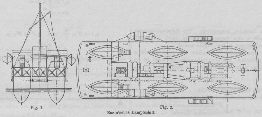 Fig. 1 und 2 geben nach Engineering, 1897 * S. 76, Abbildungen des Bazin'schen Dampfschiffes, dessen Anordnung übrigens