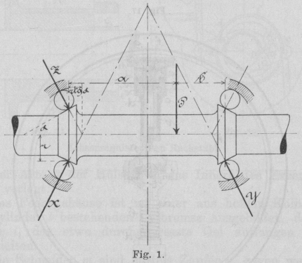 zeigt eine auf Kugeln gelagerte Achse; die Konusflächen besitzen eine Neigung α. Sämtliche Reaktionen müssen ihre Angriffspunkte auf