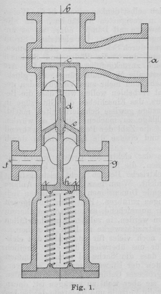 tritt das von der Speisepumpe gelieferte Wasser ein, bei f tritt es in die Röhre, welche es zum Dampfkessel leitet. Ueber c herrscht der Kesseldruck, unter e der Kesseldruck plus dem Druck z. Dieser Drucküberschuss wird aufgehoben durch das