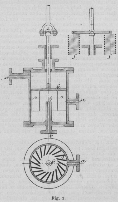 Der Kolben k trägt auf der Unterseite Schaufeln s, deren Stellung der Grundriss erkennen lässt. Das bei