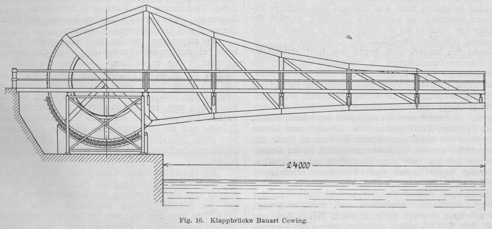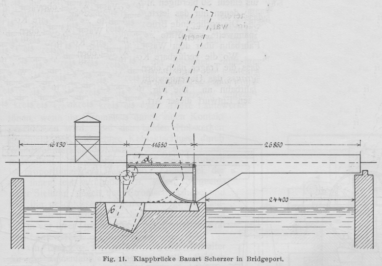 Der Zapfenbrücke kommt an Beliebtheit ungefähr gleich die Rollklappbrücke (rolling lift bridge) Bauart Scherzer (Fig. 11). Dieser Konstruktion