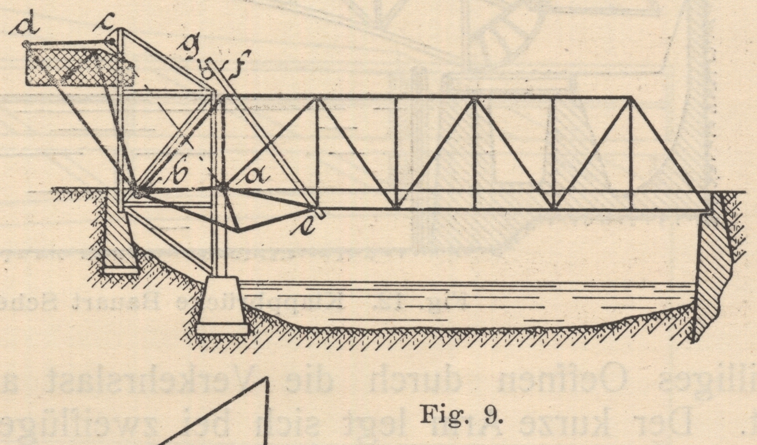 aufgehängt ist und durch eine Stange cd, die bei c mit dem Brückenauflagerpfosten, bei d mit dem Gegengewicht e