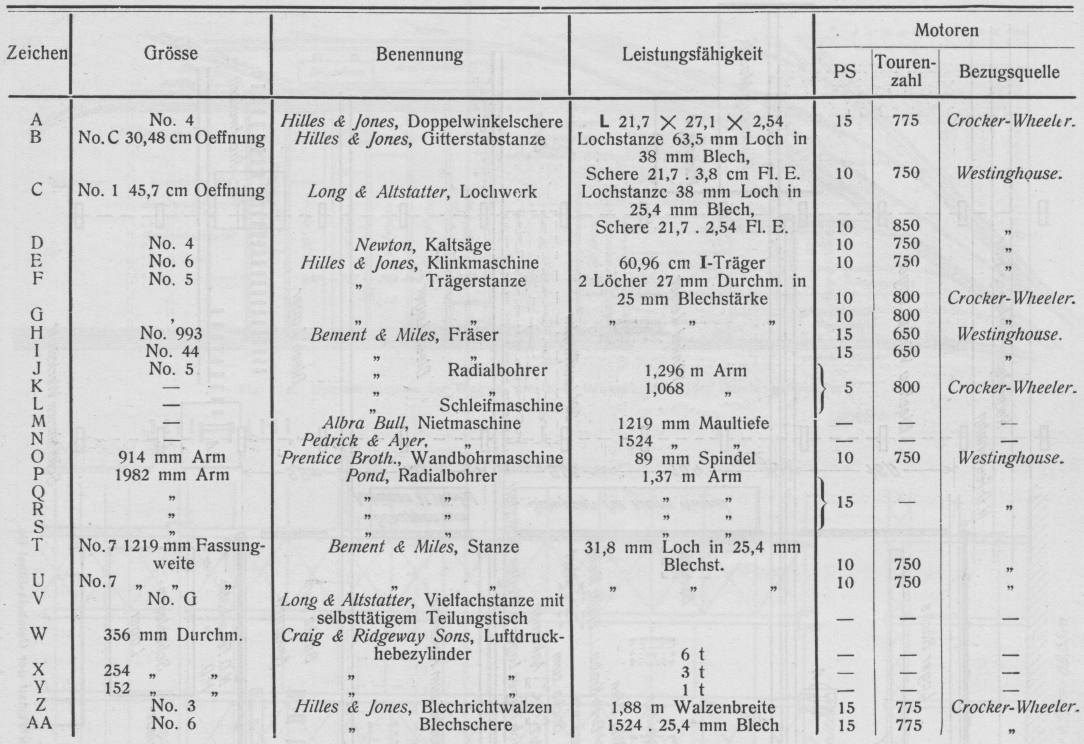 19 zu 2 t, wovon die schweren für die stationären Nietmaschinen, die leichten zur
