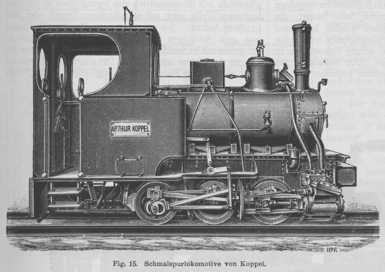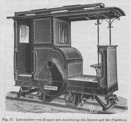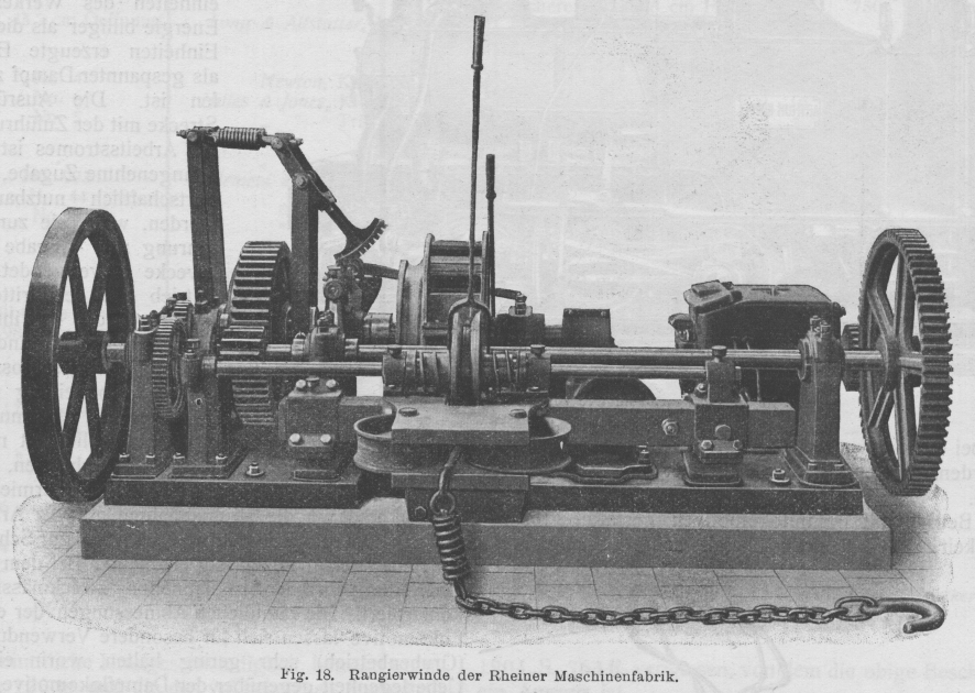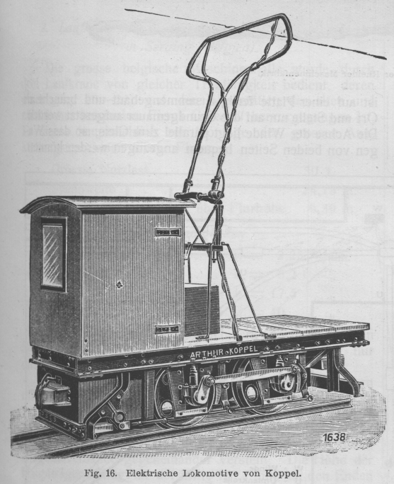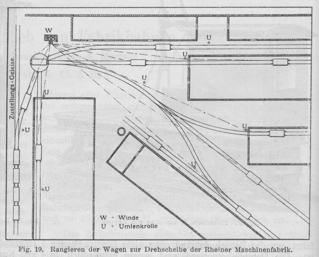 Anlage und Betrieb von Fabrikbahnen. Von Regierungsbaumeister Hans A. Martens. (Fortsetzung von S. 63 d. Bd.) Anlage und Betrieb von Fabrikbahnen. Triebkraft. Für die Zugkraft zur Beförderung der Lasten kommen in Betracht: menschliche, tierische und Maschinenkraft, letztere in den beiden Formen als Dampf- oder elektrische Kraft in Lokomotiven oder Rangier winden. Die Wahl der Triebkraft ist das schwierigste Kapitel der Fabrikbahnen, für das sich am wenigsten schematisierende Normalrezepte vorschreiben lassen. Die täglich zu leistende Fördermenge, die Wege der Förderung, die Beschaffenheit der Förderlasten, welche die Art der Förderung bestimmen, bilden die Grundlage zur Wirtschaftsberechnung für die zu wählende Art und Grösse der Triebkraft. Kostenaufstellungen zu Vergleichszwecken sind zu beurteilen nach den örtlichen Preisen für Arbeitslöhne, Viehfutter, Kohle und sonstige Heizstoffe und für die im Grossbetriebe erzeugte Energie. Aus den in der Einleitung gegebenen Vergleichszahlen über Zeit- und Geldaufwand bei Verwendung menschlicher, tierischer und maschineller Zugkraft, sowie aus der Erfahrung aller Werke, welche den Kraftbetrieb an Stelle der erstgenannten einführten, geht seine volle Ueberlegenheit hervor, so dass es keiner weiteren Begründung an dieser Stelle bedarf für das Bestreben, ihn vorherrschend einzuführen, d.h. die Betriebsverhältnisse so zu gestalten, dass er eingeführt werden kann: Sind doch in besonderen Fällen mit Einführung des Kraftbetriebes für Förderzwecke auf Industriebahnen wirtschaftliche Ersparnisse bis zu 60 v. H. erzielt worden! Im Durchschnitt gibt Arthur Koppel die Verbilligung durch Einführung des elektrischen Bahnbetriebes gegenüber Pferdebetrieb zu 40 bis 50 v. H. und zu 25 bis 35 v. H. gegenüber Dampfbetrieb an. Die Zwischenstufe zwischen menschlicher und Maschinenkraft, die tierische Zugkraft, kann wohl als leistungsfähig angesehen werden, ist jedoch wegen ihrer Unwirtschaftlichkeit nach Möglichkeit durch Maschinenkraft zu ersetzen. Gebraucht schon jedes Zugtier (bezw. je zwei) einen besonderen Führer, wodurch die Betriebskosten auf die Lasteinheit recht hoch werden, so kommt der Umstand noch hinzu, dass die schwersten Zugpferde durch die erhöhte Zugkraft beim Anziehen, sofern dies häufig vorkommt (bei vorzugsweisem Rangierbetrieb) bald dienstunfähig werden, mithin ihre Betriebsdauer nur kurz anzusetzen ist. Textabbildung Bd. 321, S. 71 Fig. 15. Schmalspurlokomotive von Koppel. Textabbildung Bd. 321, S. 71 Fig. 16. Elektrische Lokomotive von Koppel. Der Betrieb mit Dampflokomotiven gestattet grösste Freizügigkeit und hat noch überall seine Vorzüge entfaltet, wo der Betrieb dauernd ohne viele längere Pausen ist. Die Dampflokomotiven sind wenig empfindlich in der Wartung, leicht in Stand zu halten durch jeden guten Maschinenschlosser, der gleichzeitig Maschinist ist; es lassen sich grosse Leistungen durch hohen Dampfdruck und Verwendung aller Achsen als Kuppelachsen erzielen. Der Heizer als Hilfe des Maschinisten lässt sich in den meisten Fällen bei flottem Betrieb nicht entbehren. Den üblichen Typus einer Schmalspurlokomotive, Bauart Arthur Koppel, Berlin, zeigt Fig. 15. Textabbildung Bd. 321, S. 71 Fig. 17. Lokomotive von Koppel mit Anordnung des Motors auf der Plattform. Mehr und mehr führt sich auf Fabrikbahnen die elektrische Lokomotive ein, da die ihr zugeführte, in grossen Maschineneinheiten des Werkes erzeugte Energie billiger als die in kleinen Einheiten erzeugte Energieform als gespannter Dampf zu beschaffen ist. Die Ausrüstung der Strecke mit der Zuführungsleitung des Arbeitsstromes ist zwar eine unangenehme Zugabe, kann aber wirtschaftlich nutzbar gemacht werden, wenn sie zur Stromfortführung und -Abgabe für andere Zwecke mitverwendet wird. Der Betrieb mit der dritten Schiene ist wegen der mit ihr verbundenen Lebensgefahr und Verkehrshinderung ausgeschlossen, so dass nur die Oberleitung verwendbar st. Die reine Akkumulator-Lokomotive wird wegen ihrer Unwirtschaftlichkeit nur dort benutzt, wo Rauch und Funkenwurf (Bleichereien, Tunnelbahnen, Innenräume, Pulverfabriken) streng vermieden werden müssen und wo die Stromabnahme von der Arbeitsleitung und der Uebergang des Stromes vom Rad zur Schiene wegen der Feuersgefahr unzulässig erscheint. Bei dem System mit Oberleitung wird der Stromabnehmer zweckmässig als Bügel konstruiert. Die räumlichen Abmessungen der elektrischen Lokomotive lassen sich für besondere Verwendungszwecke (Grubenbetrieb) sehr gering halten, worin eine weitere Ueberlegenheit gegenüber der Dampflokomotive liegt. Die Lokomotiven sind zweiachsig. Wo ein Motor ausreicht, empfiehlt sich die Kupplung beider Achsen durch Kurbel und Kuppelstangen zur Erhöhung des Reibungsgewichts. Eine elektrische Lokomotive, deren eine Hälfte als Plattformwagen zur Lastenförderung eingerichtet ist, in der Bauart Arthur Koppel, Berlin, zeigt Fig. 16. Bei Spurweiten von 460 bis 600 mm lassen sich Motoren von 4 bis 12 PS noch bequem auf den Achsen einbauen. Motoren grösserer Leistung müssen auf die Plattform der Lokomotive gestellt werden und durch Stirnrädervorgelege mit der Treibachse verbunden werden, eine Bauart, die immer nur als Notbehelf angesehen werden kann und wegen der Verringerung des Wirkungsgrades vermieden werden sollte. Fig. 17 zeigt eine solche Lokomotive in der Ausführung von Arthur Koppel, Die Bedienung der elektrischen Lokomotive ist bei weitem einfacher als die der Dampflokomotive; zur Führung genügt ein Mann. Beschädigungen am elektrischen Teil können unliebsame plötzliche Betriebsstörungen hervorrufen, wenn nicht Aushilfsteile in genügender Anzahl vorrätig gehalten werden. Textabbildung Bd. 321, S. 72 Fig. 18. Rangierwinde der Rheiner Maschinenfabrik. Die Bemessung der Maschinengrösse spielt eine wichtige Rolle. Geschickte Verteilung der Tagesförderung auf einen längeren Zeitraum, gleichbedeutend mit dem Streben nach ununterbrochener Förderung, d.h. Aus