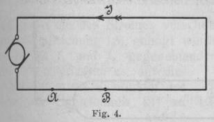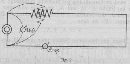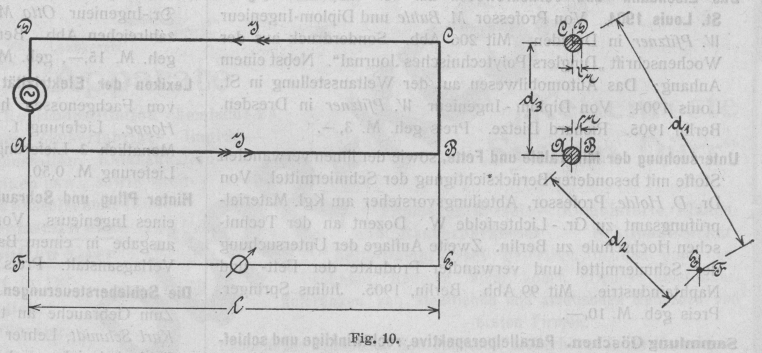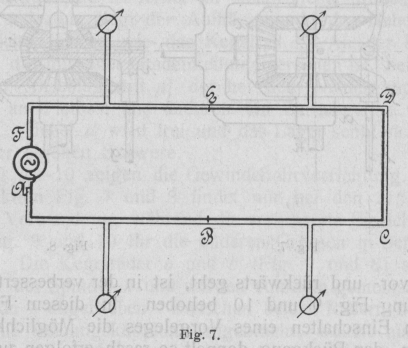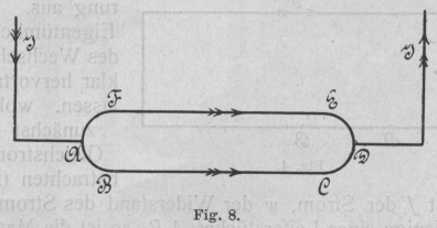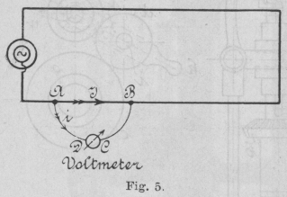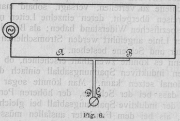 Zur Theorie der Wechselstromkreise. Von Leo Lichtenstein, Berlin. (Fortsetzung von S. 41 d. Bd.) Zur Theorie der Wechselstromkreise. Wir gehen jetzt weiter zur Betrachtung der Spannungsverteilung in einer einfachen Wechselstromschleife mit Selbstinduktion. Wenn wir von der Stromschleife mit Selbstinduktion sprechen, schliessen wir den Fall der bifilaren Leiterführung aus. Um die Eigentümlichkeiten des Wechselstromes klar hervortreten zu lassen, wollen wir zunächst einen Gleichstromkreis betrachten (Fig. 4). Textabbildung Bd. 321, S. 109 Fig. 4. Ist J der Strom, w der Widerstand des Stromkreises, w1 derjenige eines Leiterstückes AB, so ist die Maschinenspannung E = w . J, die Spannung zwischen A und B E1= w1 . J. Wie gross ist nun die Spannung zwischen den Punkten A und B bei Wechselstrom? Sie ist nicht mehr, wie bei Gleichstrom, gleich w1j1, da bei Wechselstromkreisen mit Selbstinduktion ausser dem „ohmschen“, noch der „induktive“ Spannungsabfall auftritt. Ist dieser, für den ganzen Stromkreis berechnet, gleich E2 = 2πJ . L, so liegt es nahe, jedem Leiterstück einen seiner Länge proportionalen induktiven Spannungsabfall zuzuschreiben. Ist die Länge des Leiterstücks AB (Fig. 4) gleich l1, die der ganzen Stromschleife l, so hätte man mit einem induktiven Spannungsabfall zwischen den Punkten A und B \frac{l_1}{l}\,E_i=2\,\pi\,\sim\cdot J\cdot L\cdot \frac{l_1}{l} zu rechnen. Der gesamte Spannungsabfall oder die „Potentialdifferenz“ an AB würde danach \sqrt{(w_1\,J)^2+\left(2\,\pi\,\sim\cdot J\cdot L\cdot \frac{l_1}{l}\right)^2} betragen. Diese Art den induktiven Spannungsabfall längs der Stromschleife zu verteilen, versagt, sobald man zu den Stromkreisen übergeht, deren einzelne Leiter nicht denselben spezifisghen Widerstand haben; als Beispiel mögen in erster Linie angeführt werden Stromschleifen, die aus Fahrleiter und Schiene bestehen. Denn es könnte zweifelhaft erscheinen, ob man auch hier den induktiven Spannungsabfall einfach der Länge proportional setzen kann. Man könnte sogar bestimmt sagen, dass bei der Schiene, der höheren Permeabilität wegen, der induktive Spannungsabfall bei gleicher Länge grösser, als bei dem Fahrleiter ausfallen müsste. Nun, wir haben an anderer Stelle bereits gesehen, dass die Festsetzung eines Selbstinduktionskoeffizienten pro Längeneinheit nicht eindeutig möglich ist. Wir können daher im voraus sagen, dass auch die Aufgabe, den induktiven Spannungsabfall längs der Stromschleife zu verteilen, nicht eindeutig lösbar ist. Wir überzeugen uns davon durch folgende einfache Ueberlegung. Hat der „gesamte Spannungsabfall“ zwischen A und B (Fig. 5), d.h. die geometrische Summe des „ohmschen“ und des zu bestimmenden „induktiven“ Spannungsabfalles einen bestimmten eindeutigen Wert, so muss es möglich sein, den zuerst genannten Spannungsabfall durch geeignete Vorkehrungen experimentell zu bestimmen. Ist dies nicht möglich, so kann man von einem Spannungsabfall an der Leiterstrecke AB nicht sprechen. Legt man nun an AB ein Voltmeter, so wird dieses je nach der Lage der Zuführungsdrähte verschiedene Werte anzeigen. Es handelt sich hierbei keineswegs um die Beeinflussung des Instruments durch das magnetische Feld des Schleifenstromes, denn dasselbe Verhalten wird man beobachten, wenn der Spannungszeiger von der Stromschleife weit entfert liegt. Diese Erscheinung ist sehr leicht zu erklären. Textabbildung Bd. 321, S. 110 Fig. 5. Betrachten wir die Stromschleife ABCD und bezeichnen den Strom im Leiter AB mit J, den Strom in den Spannungsdrähten mit i, den Widerstand des Leiterstückes AB mit W, den Widerstand des Voltmeters mit w, die durch den Stromkreis ABCD hindurchgehende Kraftlinienzahl mit N. Da in ABCD wirksame elektromotorische Kräfte nicht vorhanden sind, so gilt nach den Sätzen von Kirchhoff und Helmholz die Gleichung J_t\,W-i_t\,w=-\frac{d\,N_t}{d\,t} i1w ist die von dem Voltmeter angezeigte Spannung V_s=+J_t\,W+\frac{d\,N_t}{d\,t} Aendert man nun die Lage der Spannungsdrähte, mithin den Flächeninhalt der Stromschleife ABCD, so wird gleichzeitig Nt, folglich auch Vs geändert. Wir sehen also tatsächlich, dass die Angaben des Voltmeters von der Lage der Spannungsdrähte abhängen. Die „Spannung zwischen zwei Punkten einer Wechselstromschleife“ ist kein eindeutig definierbarer Begriff. Legen wir jetzt die beiden Zuführungsdrähte direkt an den Leiter AB (Fig. 6), so wird Nt = 0 und V s = + J t W. Schaltet man das Voltmeter so, wie in Fig. 6 angegeben ist, so misst man den ohmschen Spannungsabfall des betrachteten Leiterstückes. Der ohmsche Spannungsabfall ist also eindeutig definiert und messbar. Textabbildung Bd. 321, S. 110 Fig. 6. Bei der Projektierung der Leiteranlagen für Wechselstrombahnen wird bisweilen verlangt, dass die Potentialdifferenz zwischen zwei beliebigen Punkten der Schiene einen bestimmten Höchstwert nicht überschreitet. In diesem Falle ist als „Potentialdifferenz“ der ohmsche Spannungsabfall in den Schienen JtW anzusehen. Von einer Potentialdifferenz im eigentlichen Sinne des Wortes kann bei Wechselstrom, wie wir gesehen haben, natürlich nicht die Rede sein. Textabbildung Bd. 321, S. 110 Fig. 7. Im Anschluss an das soeben erörterte wollen wir folgende Betrachtungen anstellen. Denken wir uns den Stromkreis ACDF (Fig. 7) in bestimmte Anzahl Teile zerlegt und messen nach der in Fig. 6 angegebenen Schaltung die „Potentialdifferenz“ oder den „ohmschen Spannungsabfall“ J. W (Effektivwert) nacheinander zwischen AB, BC, CD, DE, EF. Die gemessenen Spannungen bezeichnen wir mit V1, V2, – – – V5. Die Maschinenspannung sei V. Bei Gleichstrom ist offenbar V=J\,W=\sum_{n=1}^5\,J\,W=V_1+V_2+\_\,\_\,\_+V_5. Bei Wechselstrom ist aber V=\sqrt{J\,W^2+(2\,\pi\,\sim\,L\,J)^2}\,>\,J\,W, d.h. V > V1 + V2 + – – – + V5. Wir wollen noch eine Eigentümlichkeit der Wechselstromkreise erwähnen. Betrachten wir eine Stromverzweigung Fig. 8. Textabbildung Bd. 321, S. 110 Fig. 8.