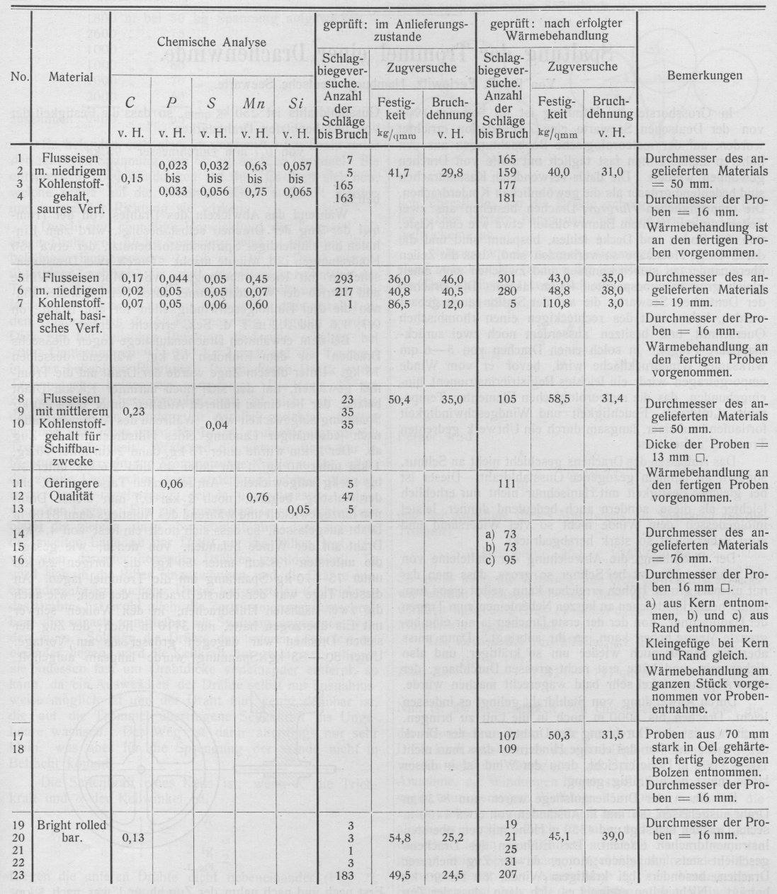 C; P; S; Mn; Si; geprüft: im Anlieferungszustande; Schlagbiegeversuche. Anzahl