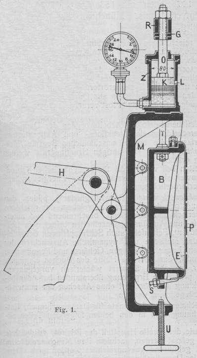 dem Zylinder Z, in welchem sich der Kolben K bewegt und einem Manometer. Die Bremsbacke B ist an der Bremsfläche mit mehreren Bandeisen E versehen, auf welchen Kupferplatten P genietet sind. Dadurch wird die durch das Bremsen