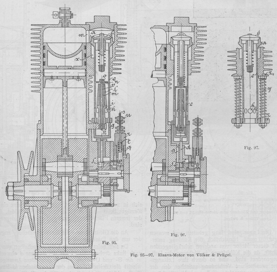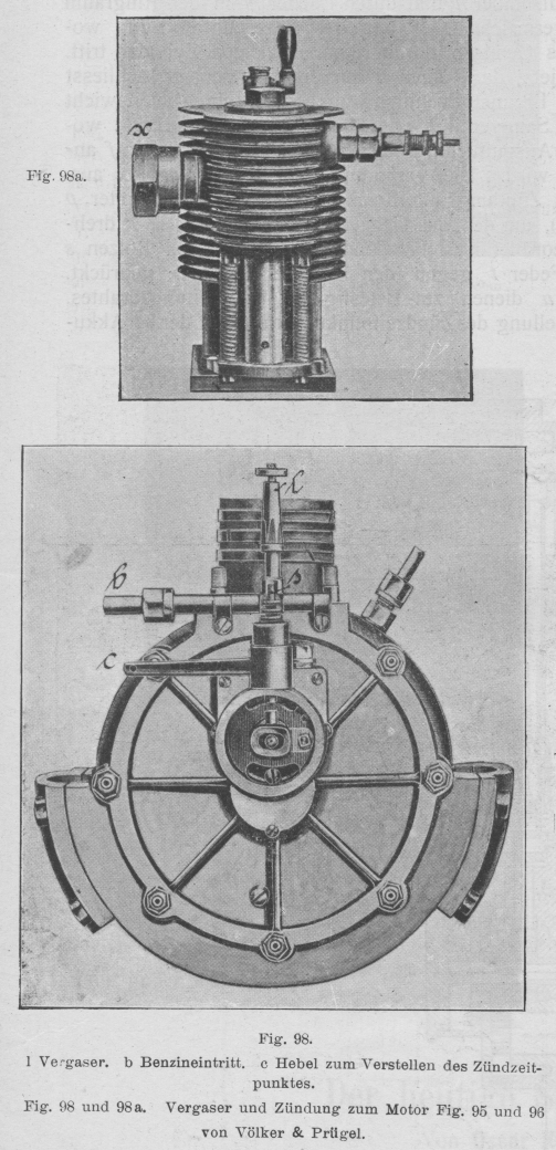 Fig. 98 und 98a. Vergaser und Zündung zum Motor Fig. 95 und 96 von Völker