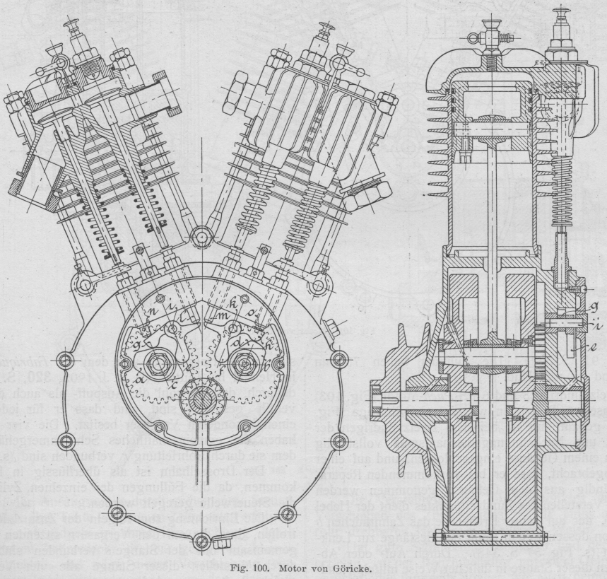 Der Antrieb des Zündapparates erfolgt ebenfalls durch das Kegelrad a in derselben Weise wie beim Einzylindermotor (Fig. 91, S. 381). Die Zylinder haben 75 mm Bohrung