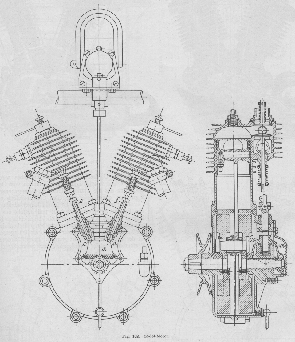 Fig. 102 zeigt den 5½ PS-Zedel-Motor mit automatischen Ansaugventilen. Die Steuerung der