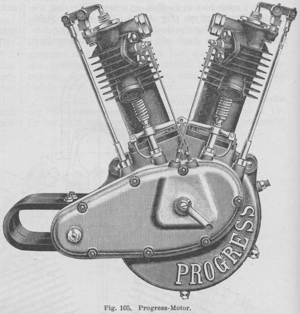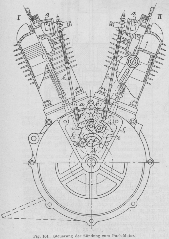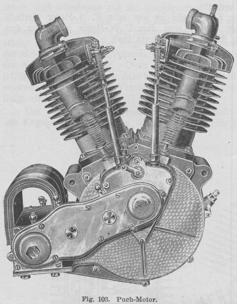 Der zweizylindrige 5 und 6 PS-Puch-Motor (Fig. 103) ist nach denselben Prinzipien wie der