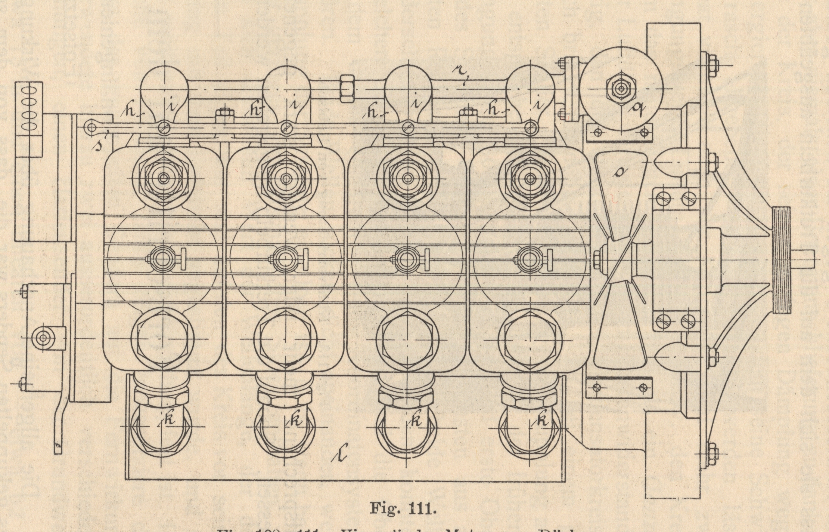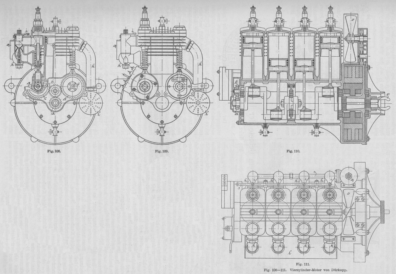 108–111 zeigenden 4½ PS-Vierzylinder-Motor der Bielefelder Maschinenfabrik vorm. Dürkopp & Co. Er hat 52,5 mm