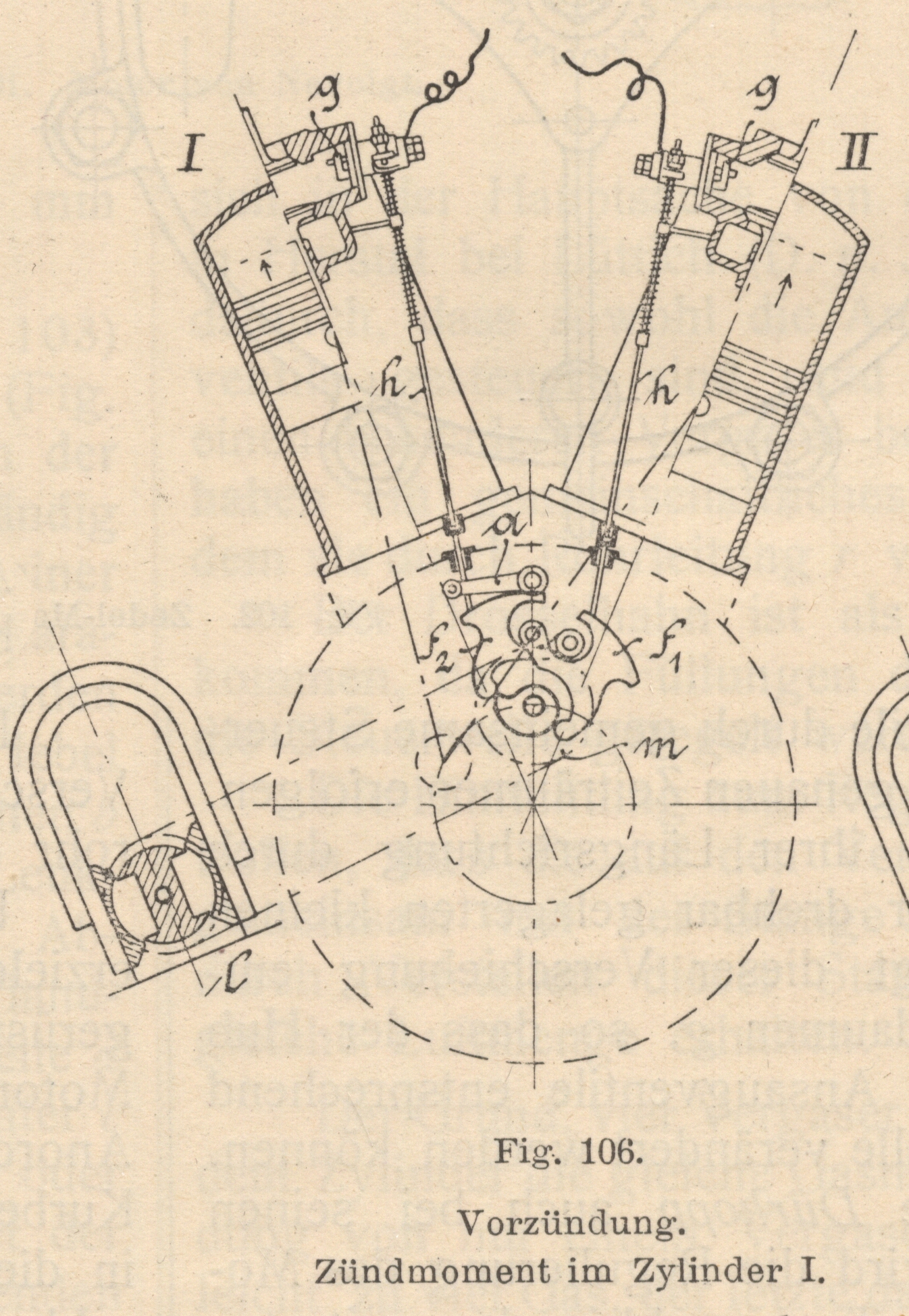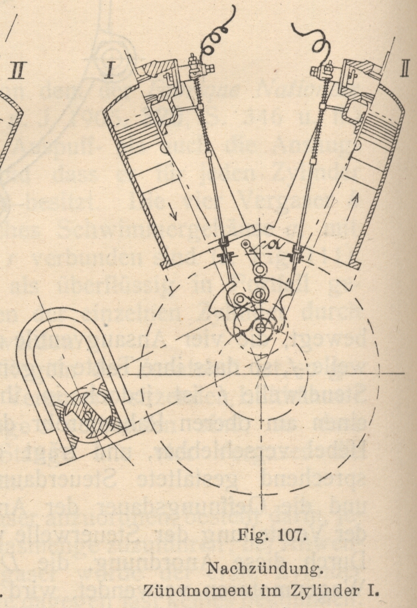 Vorzündung Zündmoment im Zylinder I; Fig. 107. Nachrundung Zündmoment im