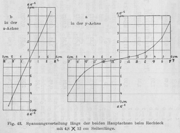 Fig. 43. Spannungsverteilung längs der beiden Hauptachsen beim Rechteck mit
