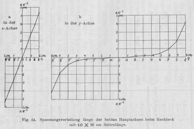 Fig. 44. Spannungsverteilung längs der beiden Hauptachsen beim Rechteck mit