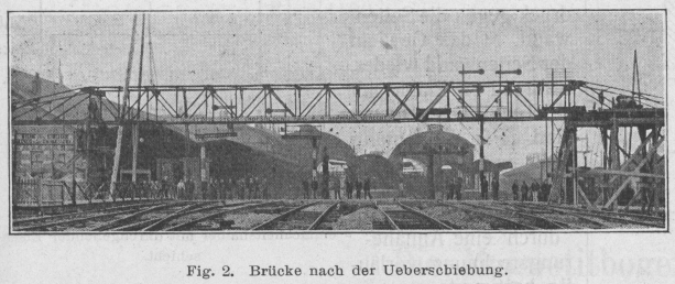 der erforderlichen Höhe auf einem starken Holzgerüst zusammengestellt (Fig. 1), wobei die Brücke vorne mit einer 10 m langen