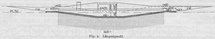 Neigung von 1 : 40 bis unmittelbar vor der Brücke, wo eine Tiefe von 1,15 – NW erreicht wird; hier schliesst sich eine ebene