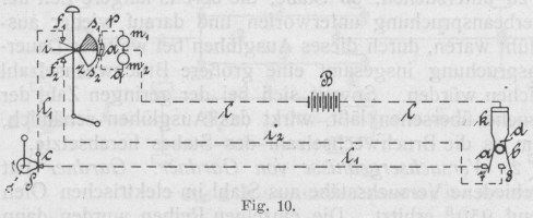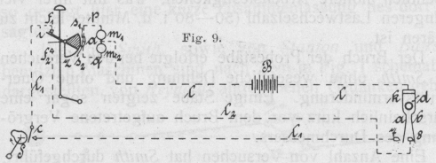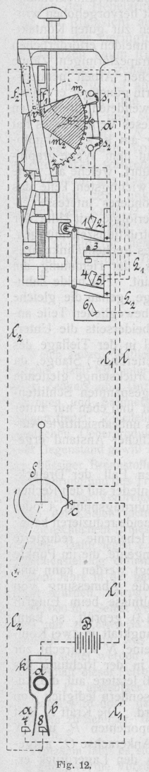 Kontaktvorrichtung vermittelt die Fortsetzung des Stromweges vom Zahnrechen z zu einer der beiden Leitungen l1 oder l2 (Fig. 9, 10 und 13), je