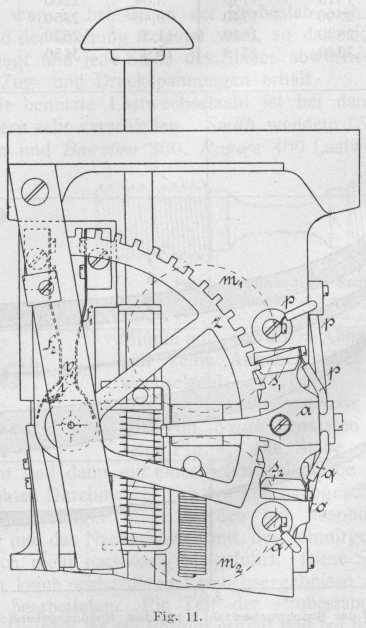 Abweichungen bestehen jedoch darin, daß der Auslöserechen z (Fig. 9–12) nicht dreieckige, sondern nahezu rechteckige Zähne hat und von seiner