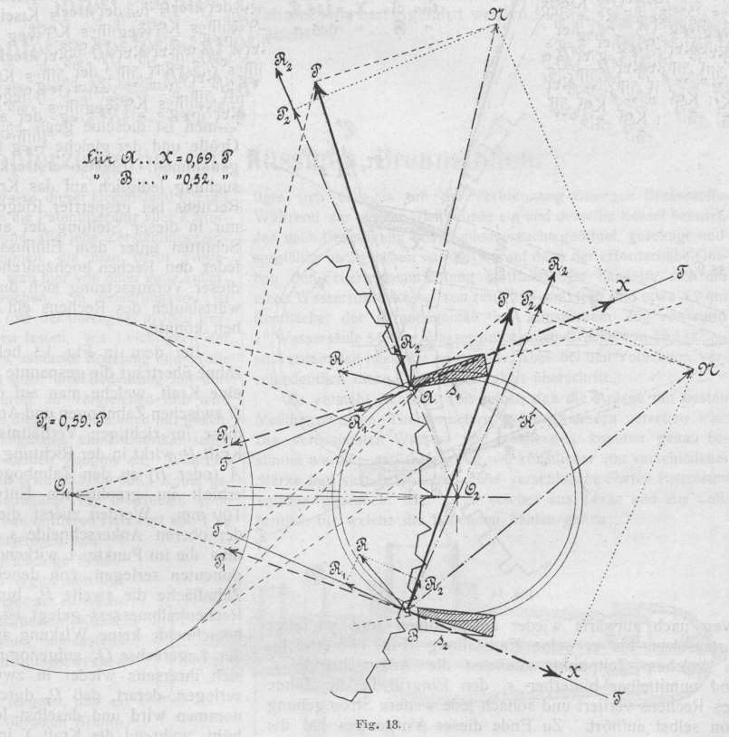 ausgedrückt, 69 mm, so daß sich X = 0,69 P ergibt. Genau dieselbe Kräftezerlegung, welche vorhin