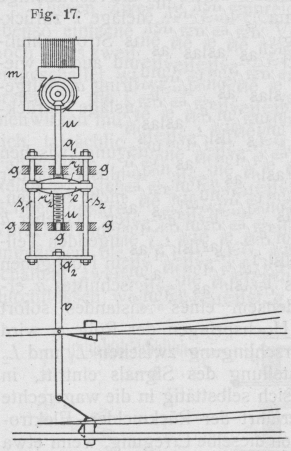 Motor gelangt, je nach der Richtung dieses Stromes die Stange v vermittels der besagten Uebertragungsteile von m hin- oder zurückgeschoben bezw. die Weiche in dem