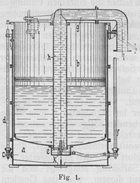 Der Apparat besteht aus einem zylindrischen gußeisernen Gefäß a (Fig. 1), welches aus einzelnen