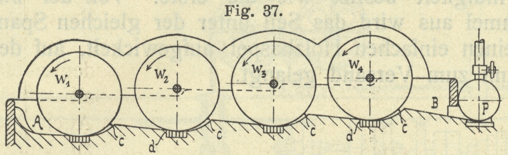 Stofftransportvorrichtung an. Eine Vielheit von Walzen schlägt Georg Schultz vor (D. R. P. 162957). (Fig. 37 und 38). Fast
