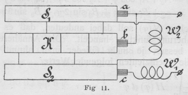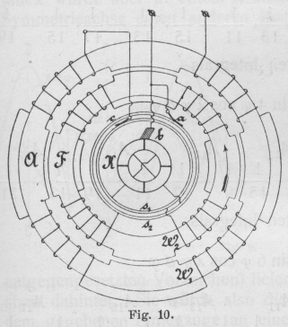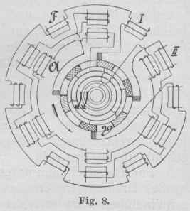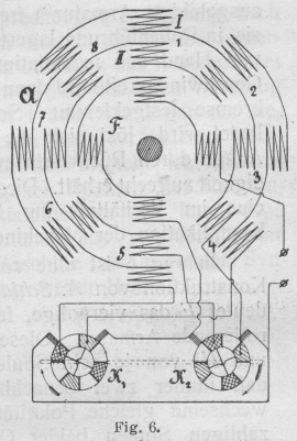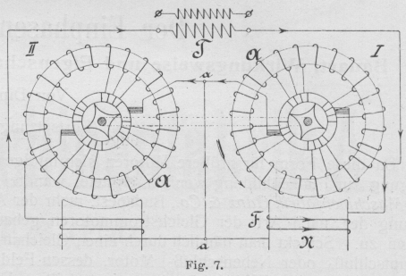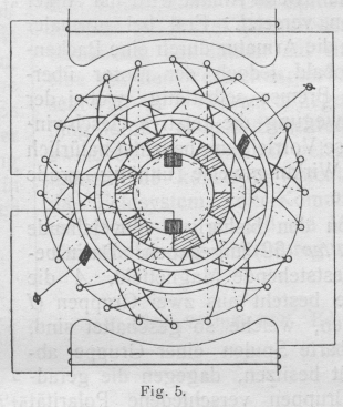 Der Einphasen-Wechselstrommotor. Bauart, Wirkungsweise und Eigenschaften der bisher angegebenen Konstruktionen. Von Dipl.-Ing. A. Linker. (Fortsetzung von S. 645 d. Bd.) Der Einphasen-Wechselstrommotor. Da diese Form für größere Motoren sich infolge der Neigung zur Funkenbildung weniger eignete, wandte sich die Maschinenfabrik Ganz & Co., Budapest, mehr der Ausbildung der nach Art der Gleichstrommotoren gebauten Typen zu. Schickt man nämlich durch einen Gleichstrom-(Hauptschluß- oder Nebenschluß-) Motor, dessen Feld zur Vermeidung starker Wirbelströme aus unterteiltem Eisen besteht, einen Wechselstrom, so entsteht ein Drehmoment, durch welches der Anker in Umdrehung versetzt wird. Da nun die Bürsten in der neutralen Zone stehen, so wird gerade diejenige Spule, welche in dieser Zone liegt, kurzgeschlossen. Hierbei umschließt sie jedoch den maximalen Kraftfluß, wodurch analog der kurzgeschlossenen Sekundärwicklung eines Transformators starke Ströme -induziert werden, die beim Ablaufen der Bürste schädliche Funken am Kommutator hervorrufen. Diesen Uebelstand haben Ganz & Co. nach einem Patent von 0. T. Blàthy (24, 25) dadurch zu beseitigen versucht, daß sie zwischen je zwei Kommutatorsegmente einen toten Sektor einlegten, der so breit war, daß eine Bürste zwei wirksame Segmente zu gleicher Zeit nicht berühren konnte. Dadurch wurde jedoch bei Nebenschlußmaschinen der Strom in der Armatur, bei Hauptschlußmaschinen in Armatur und Feld für kurze Zeit unterbrochen. Zur Vermeidung dieser Erscheinung wurden dann die Zwischensegmente ebenfalls an besondere Wicklungen angeschlossen, wodurch man eine mehrfach geschlossene Wicklung erhielt. Fügt man n Sektoren in einer Zwischengruppe ein, so darf die Bürste höchstens n Segmente bedecken. Die Hilfswicklungen brauchten nur der Windungs- oder Drahtzahl nach mit der Hauptwicklung übereinzustimmen, dagegen konnte der Drahtquerschnitt ein anderer sein. Für Hauptschlußmotoren würde diese Anordnung ein großes Drehmoment ergeben, jedoch ändert sich ihre Geschwindigkeit stark mit der Belastung, während Nebenschlußmaschinen beim Lauf infolge der großen Phasenverschiebung zwischen Ankerstrom und induzierter elektromotorischer Gegenkraft nur geringe Zugkraft besitzen. Daher wurde das Feld mit dem durch den Kommutator bei Synchronismus gleichgerichteten Wechselstrom erregt, wie Fig. 5 zeigt. Der Anker erhielt dann den Wechselstrom durch Schleifringe zugeführt, die mit diametralen bezw. um 180 elektr. Grad auseinander liegenden Lamellen verbunden waren. Erwähnt sei ferner eine KonstruktionE. T. Z. Sept. 1889, S. 433 und 1890, S. 587. Comptes Rendus. 31, Juli 1889. von M. Leblanc (32, 42), deren Eigentümlichkeit darin besteht, daß dem mit einer gleichmäßig verteilten Wicklung versehenen und feststehenden Feld durch zwei synchron rotierende Bürsten vermittels eines an die Wicklung angeschlossenen Kommutators der in gleichgerichteten Strom umgeformte Wechselstrom zugeführt wird. Dem mit einer Wechselstromwicklung versehenen Anker wird der Strom durch Schleifringe zugeleitet. Da sich nun die Pole des Feldsystems synchron bewegen, so wird das Drehmoment von der Ankergeschwindigkeit unabhängig und nur eine Funktion der Stromstärken im Anker und Feld. Textabbildung Bd. 322, S. 657 Fig. 5. Textabbildung Bd. 322, S. 657 Fig. 6. Zur Erreichung des synchronen Ganges führt N. Tesla (43, 48) auch dem rotierenden Teil eines nach seinen später im II. Abschnitt behandelten Ideen konstruierten Asynchronmotors durch Schleifringe Wechselstrom zu. Entweder wird der Strom wie im Stator in zwei phasenverschobene Ströme zerlegt und durchfließt die beiden parallel zueinander liegenden Rotorwicklungen, oder eine Wicklung des Rotors wird mit dem gesamten Strom gespeist, während die andere in sich kurzgeschlossen ist, oder der Rotor wird nur beim Anlauf kurzgeschlossen (44) bezw. besitzt noch eine Kurzschlußwicklung. Dabei sind verschiedene Ausführungsformen angegeben, bei denen Stator und Rotor in Reihe oder parallel geschaltet sind. Die Tourenzahl des Läufers ist gleich der doppelten synchronen, wenn die Schaltung so ausgeführt ist, daß das Rotorfeld entgegen dem Läufer mit synchroner Geschwindigkeit umläuftVergl. E. T. Z., 7. März 1901, S. 211.. Denn eine Leistung kann nur abgegeben werden, wenn beide Felder gleiche Geschwindigkeit haben. Neben dem Nachteil dieses Motors, daß er von selbst nicht anläuft, besitzt er im primären Teil körperliche Polansätze, wodurch die Bildung eines gleichförmigen Drehfeldes unmöglich wird. Ferner begünstigt diese Form die Streuung, wodurch die Ueberlastungsfähigkeit vermindert und der Leistungsfaktor erniedrigt wird. Auch zum Anlauf eines mit Gleichstrom erregten Synchronmotors verwendet N. Tesla (51) das Prinzip der Kunstphase, indem er den Anker zweiachsig wickelt und die beiden Wicklungen mit Strömen verschiedener durch Ohmschen Widerstand und Selbstinduktion hervorgerufener Phase speist. Dabei ist die Magnetwicklung für den Anlauf kurzgeschlossen, um einerseits eine hohe durch Transformatorwirkung auftretende Spannung zu vermeiden und andererseits ein stärkeres Drehmoment zu erzielen. Erst nach Erreichung einer bestimmten Geschwindigkeit wird das Feld mit Gleichstrom erregt und durch Umlegen eines Umschalters der ungeteilte Wechselstrom den beiden hintereinander geschalteten Ankerwicklungen zugeführt, wodurch der Motor seinen normalen Betriebszustand erhält. L. B. Atkinson (52) läßt durch einen kleinen, selbstangehenden Hilfssynchronmotor die Bürsten eines mit Gleichstrom erregten Synchronmotors antreiben, wodurch dieser dann leicht zum Anlauf gebracht wird. Um einen Synchronmotor schneller in Gang zu setzen, hat S. Z. de Ferranti (53) nicht nur das mit Gleichstrom erregte Magnetfeld, sondern auch die als Scheibenanker ausgebildete ArmaturE, T. Z, 2. Mai 1890, S. 266. frei drehbar ausgebildet, indem er sie in Rollenführung lagerte. Beim Anlauf wird der Anker von Hand aus in Rotat