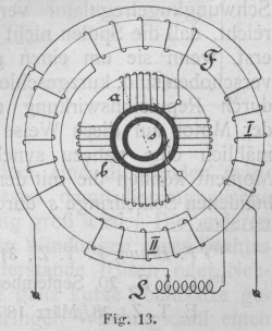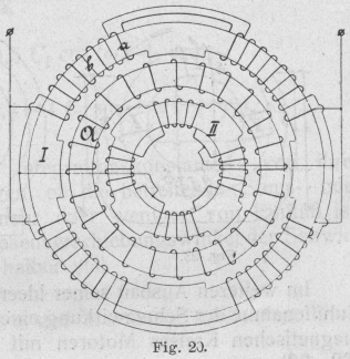 Anker umschließen, durch die primär gespeisten Spulen I. Dadurch werden in den Sekundärspulen (II) E M K' e induziert, die über die Bürsten B durch die Scheibe Ströme in der Richtung vom Umfang