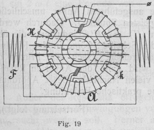 bei welcher der mit dem Wechselstrom durch Schleifringe gespeiste Anker A die Gestalt eines S besitzt und in dem mit einer