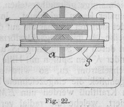 November 1890, S. 619. konstruiert, bei welchem nach Fig. 22 durch die in den Polansätzen P induzierten Wirbelströme ein gegen das Hauptfeld in
