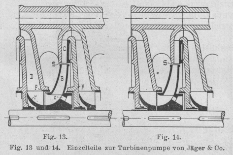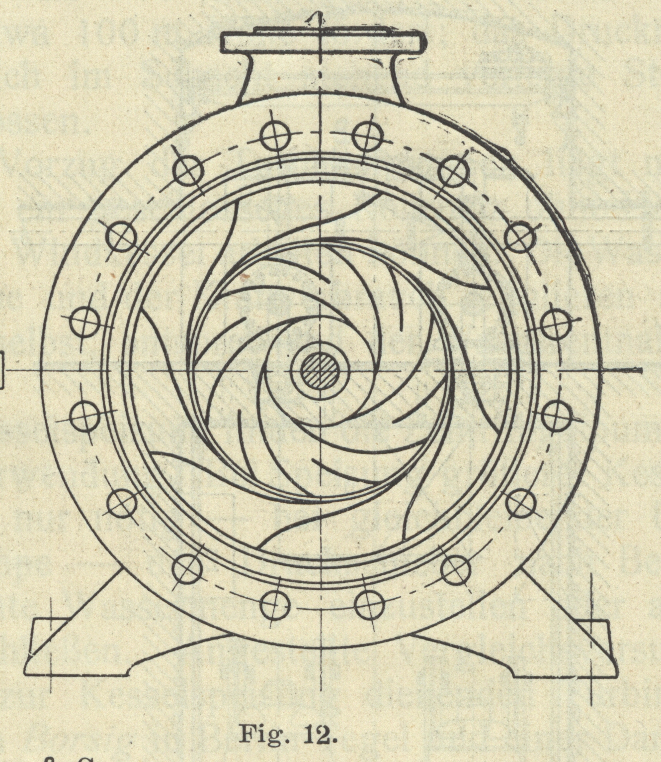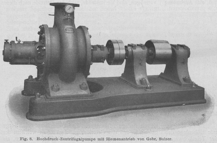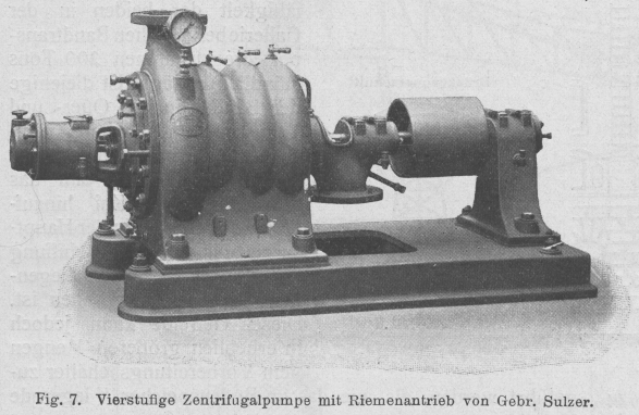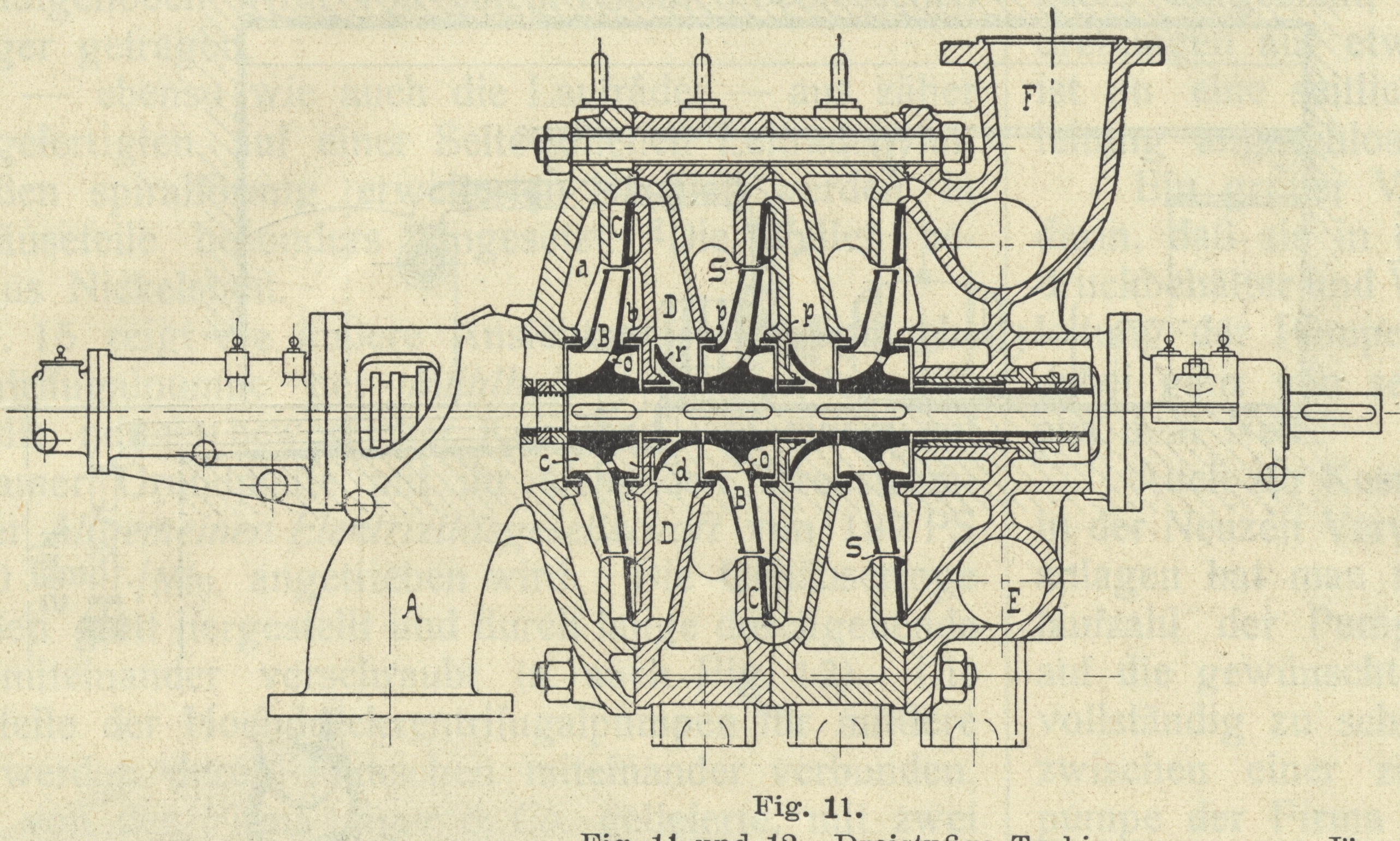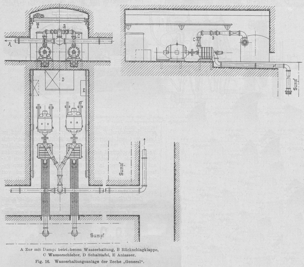 Neuere Pumpen und Kompressoren. Von Prof. Fr. Freytag, Chemnitz. (Fortsetzung von S. 789 d. Bd.) Neuere Pumpen und Kompressoren. Das Verdienst, zuerst und unbeirrt durch die Bedenken, welche die Vertreter der Kolbenpumpensysteme dagegen geltend machten, Hochdruck-Zentrifugalpumpen für große Wassermengen – 7 bis 8 cbm/Min. auf Förderhöhen von über 500 m (monometrisch) – in Dienst gestellt zu haben, gebührt der westfälischen Zeche „Victor“ bei Rauxel. Seitdem die für diese Zeche von Gebr. Sulzer mit Motoren der Allgemeinen Elektrizitätsgesellschaft gelieferte unterirdische Wasserhaltungsanlage vom Beginn der Inbetriebsetzung ohne Störung arbeitete, hat die elektrisch angetriebene Zentrifugalpumpe, besonders auch im Bergbau, eine immer größere Verbreitung gefunden. Während bis vor wenigen Jahren für die zum Antriebe solcher Pumpen dienenden schnellaufenden Motoren 300 bis 400 PS als Höchstleistung galt, sind heute hierfür Motoren von 1100 PS bei 1486 Uml./Min. im Bau.Mitteilung der Allgemeinen Elektrizitätsgesellschaft, Berlin. Textabbildung Bd. 322, S. 804 Fig. 7.Vierstufige Zentrifugalpumpe mit Riemenantrieb von Gebr. Sulzer. An Stelle des elektromotorischen Antriebes kommt häufig auch derjenige mittels Riemen zur Ausführung, da die Pumpen in vielen Fällen den bestehenden Betrieben angepaßt werden müssen. Fig. 7 zeigt eine vierstufige Sulzer-Hochdruck-Zentrifugalpumpe, beider die Riemenrolle zwischen Saugstutzen und einem äußeren Lager angeordnet ist, was die gleichzeitige Ausbildung des ersteren als Lager für die Pumpenwelle erfordert (s. auch Fig. 2). Textabbildung Bd. 322, S. 804 Fig. 8.Hochdruck-Zentrifugalpumpe mit Riemenantrieb von Gebr. Sulzer. Bei der Hochdruck-Zentrifugalpumpe (Fig. 8) trägt die Grundplatte zwei Lagerböcke mit zwischenliegender Riemenrolle. Besonders günstige Wirkungsgrade wurden mit Sulzerschen Senkpumpen erreicht. Eine solche, in Fig. 9 dargestellte, für eine Förderung von 16 cbm/Min. auf 45 m monometrische Förderhöhe gebaute Pumpe ergab mit 1025 minutl. Umdreh. einen Wirkungsgrad von 83 v. H., der unter etwas anderen Betriebsverhältnissen sogar bis auf 84 v. H. anstieg. Die zum Schachtabteufen ausgebildeten Senkpumpen werden, wie die Abbildung erkennen läßt, normal mit einem Drehstrommotor zusammen in ein schmiedeeisernes Gerüst eingebaut; sie erfordern nur einen geringen Raumbedarf und können frei am Seile hängend arbeiten, ohne irgendwelche Einbauten und Verlagerungen im Schachte zu beanspruchen. Textabbildung Bd. 322, S. 804 Fig. 9.Mehrstufige Senkpumpe von Gebr. Sulzer. Textabbildung Bd. 322, S. 804 Fig. 10.Mehrstufige Abteufpumpe von Gebr. Sulzer. Fig. 10 zeigt eine 400pferdige Abteufpumpe von Gebr. Sulzer, die durch vier Laufräder mit zweiseitigem Einlauf bei 975 Umläufen 8 cbm/Min. auf 165 m hebt. Ein Kammlager ist in der Abbildung nicht ersichtlich; es befindet sich oben am Motor. Textabbildung Bd. 322, S. 805 Fig. 11 und 12.Dreistufige Turbinenpumpe von Jäger & Co. Textabbildung Bd. 322, S. 805 Fig. 13 und 14. Einzelteile zur Turbinenpumpe von Jäger & Co. Die von dem Pumpen- und Gebläsewerk C. H. Jäger & Co. in Leipzig-Plagwitz gebauten Zentrifugalpumpen zeichnen sich durch eine ungemein einfache, seit Jahren vorzüglich bewährte Konstruktion aus. Textabbildung Bd. 322, S. 805 Fig. 15.Hochdruck-Zentrifugalpumpe mit elektromotorischem Antrieb von Jäger & Co. Die neuesten Verbesserungen, welche an diesen Pumpen getroffen wurden, beziehen sich auf selbsttätige Einrichtungen zur Beseitigung jeglicher Achsialdrücke, so daß die Wellenlager solche im normalen Betriebe überhaupt nicht mehr aufzunehmen haben. Fig. 11 und 12 zeigen eine dreistufige Turbinenpumpe neuester Bauart der genannten Firma. Die Flüssigkeit tritt durch das Saugrohr A in das erste Schaufelrad B ein, wird hier beschleunigt und im Leitrade C auf höheren Druck gebracht, worauf sie durch den Kanal D in das nächste Schaufelrad gelangt. Der Vorgang wiederholt sich hier, wie auch in dem folgenden Schaufelrade, bis schließlich die Flüssigkeit aus dem Kanal E der Pumpe in den Druckstutzen F derselben gelangt. Da jedes Leitrad mit zugehörigem Laufrad von einem Gehäuseteil umschlossen wird, kann durch Ein- oder Ausschaltung einzelner Stufen die Förderhöhe beliebig geändert werden. Zur Entlastung der im Gegensatz zu der Sulzerschen Turbinenpumpe mit rückwärts gebogenen Schaufeln ausgeführten Laufräder sind zu beiden Seiten jedes Rades am Gehäuse Dichtungsringe pp angebracht, die gegen entsprechende Ringflächen an der Radnabe abdichten. Durch den Spalt S am Umfange jedes Rades wird nun der Druck des Wassers in den Räumen a und b gleichmäßig verteilt; ebenso wird in den innerhalb dieser Dichtungsringe gelegenen Räumen c und d gleicher Druck infolge der Durchbohrungen o in der Radnabe hergestellt. Es ist somit jedes Rad für sich nahezu vollständig entlastet. Textabbildung Bd. 322, S. 806 Fig. 16.Wasserhaltungsanlage der Zeche „General“. A Zur mit Dampfbetriebenen Wasserhaltung, B Rückschlagklappe, C Wasserschieber, D Schalttafel, E Anlasser. Um die durch etwaige ungleiche Abnutzungen der Dichtungsringe auftretenden Achsialdrücke selbsttätig zu beseitigen, besitzt die Welle mit den Laufrädern eine geringe seitliche Verschiebbarkeit. Textabbildung Bd. 322, S. 806 Fig. 17.Zweistufige Kondensatpumpe von Jäger & Co. Der äußere Kranz jedes Rades ist zylindrisch, während die denselben einschließenden Flächen des Deckels bezw. der Gehäusewände kegelförmig gestaltet sind (s. auch Fig. 13 und 14). Erhält die Welle bezw. die Räder aus irgend einem Grunde einen seitlichen Schub, z.B. von rechts nach links, so daß sich das Rad, wie in Fig. 14 angegeben, nach links verschoben hat, so wird durch die kegelförmige Gestaltung der Gehäusewände der Spalt S auf der linken Seite vergrößert und durch das eintretende Druckwasser ein höherer Druck erzeugt werden, der das Laufrad und damit die Welle wieder nach rechts schieb