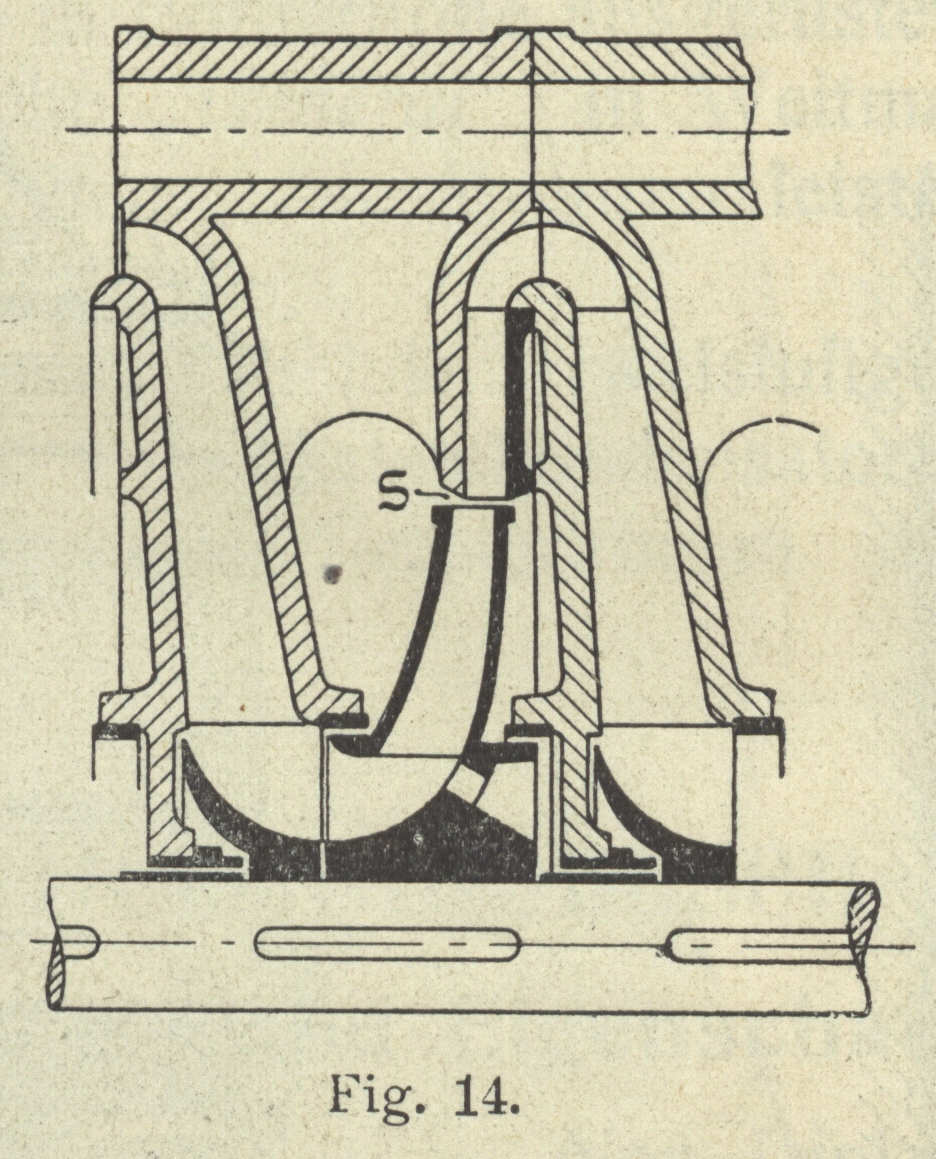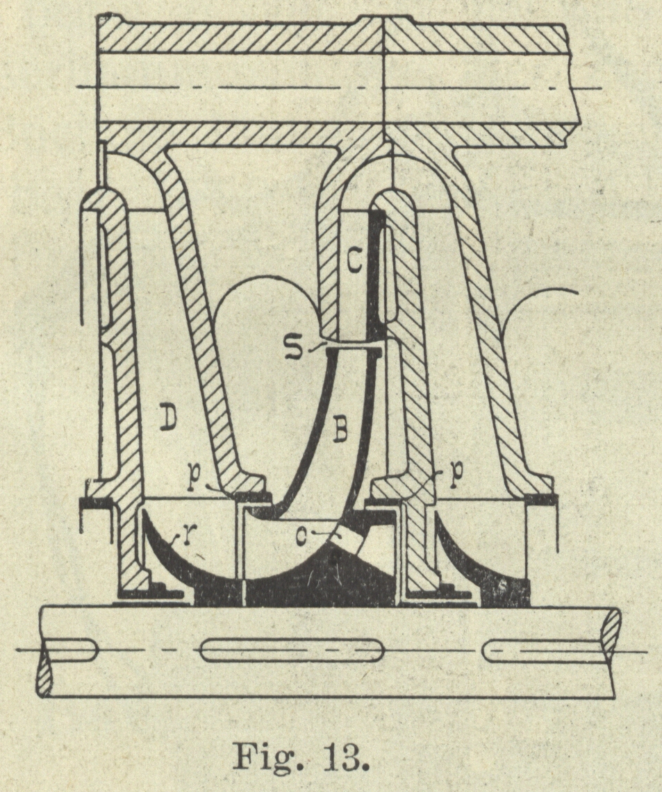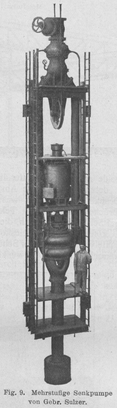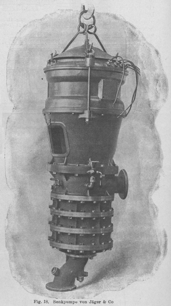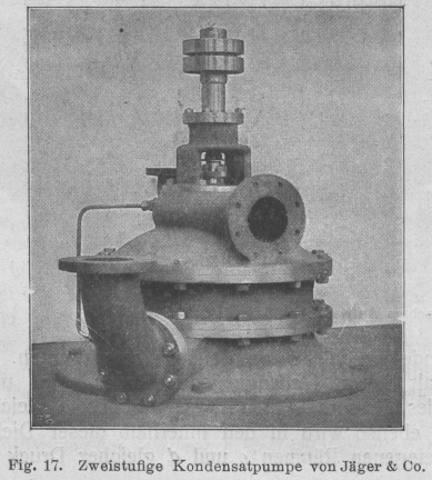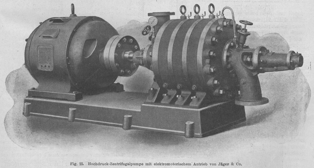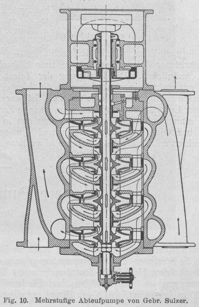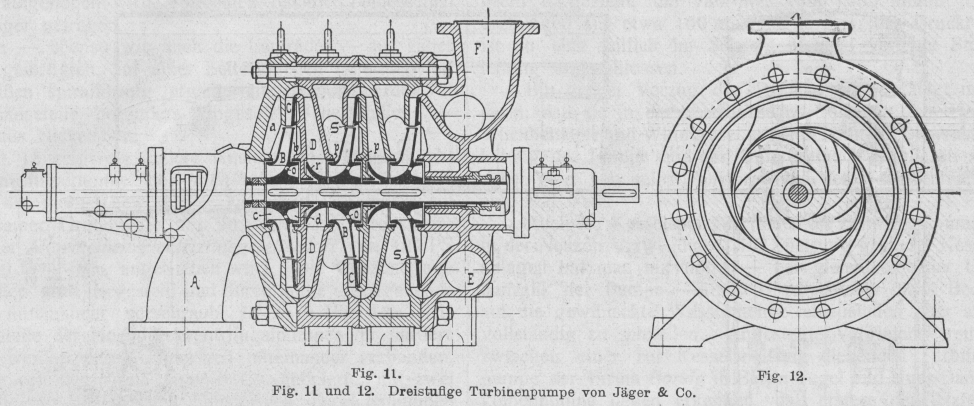 Neuere Pumpen und Kompressoren. Von Prof. Fr. Freytag, Chemnitz. (Fortsetzung von S. 789 d. Bd.) Neuere Pumpen und Kompressoren. Das Verdienst, zuerst und unbeirrt durch die Bedenken, welche die Vertreter der Kolbenpumpensysteme dagegen geltend machten, Hochdruck-Zentrifugalpumpen für große Wassermengen – 7 bis 8 cbm/Min. auf Förderhöhen von über 500 m (monometrisch) – in Dienst gestellt zu haben, gebührt der westfälischen Zeche „Victor“ bei Rauxel. Seitdem die für diese Zeche von Gebr. Sulzer mit Motoren der Allgemeinen Elektrizitätsgesellschaft gelieferte unterirdische Wasserhaltungsanlage vom Beginn der Inbetriebsetzung ohne Störung arbeitete, hat die elektrisch angetriebene Zentrifugalpumpe, besonders auch im Bergbau, eine immer größere Verbreitung gefunden. Während bis vor wenigen Jahren für die zum Antriebe solcher Pumpen dienenden schnellaufenden Motoren 300 bis 400 PS als Höchstleistung galt, sind heute hierfür Motoren von 1100 PS bei 1486 Uml./Min. im Bau.Mitteilung der Allgemeinen Elektrizitätsgesellschaft, Berlin. Textabbildung Bd. 322, S. 804 Fig. 7.Vierstufige Zentrifugalpumpe mit Riemenantrieb von Gebr. Sulzer. An Stelle des elektromotorischen Antriebes kommt häufig auch derjenige mittels Riemen zur Ausführung, da die Pumpen in vielen Fällen den bestehenden Betrieben angepaßt werden müssen. Fig. 7 zeigt eine vierstufige Sulzer-Hochdruck-Zentrifugalpumpe, beider die Riemenrolle zwischen Saugstutzen und einem äußeren Lager angeordnet ist, was die gleichzeitige Ausbildung des ersteren als Lager für die Pumpenwelle erfordert (s. auch Fig. 2). Textabbildung Bd. 322, S. 804 Fig. 8.Hochdruck-Zentrifugalpumpe mit Riemenantrieb von Gebr. Sulzer. Bei der Hochdruck-Zentrifugalpumpe (Fig. 8) trägt die Grundplatte zwei Lagerböcke mit zwischenliegender Riemenrolle. Besonders günstige Wirkungsgrade wurden mit Sulzerschen Senkpumpen erreicht. Eine solche, in Fig. 9 dargestellte, für eine Förderung von 16 cbm/Min. auf 45 m monometrische Förderhöhe gebaute Pumpe ergab mit 1025 minutl. Umdreh. einen Wirkungsgrad von 83 v. H., der unter etwas anderen Betriebsverhältnissen sogar bis auf 84 v. H. anstieg. Die zum Schachtabteufen ausgebildeten Senkpumpen werden, wie die Abbildung erkennen läßt, normal mit einem Drehstrommotor zusammen in ein schmiedeeisernes Gerüst eingebaut; sie erfordern nur einen geringen Raumbedarf und können frei am Seile hängend arbeiten, ohne irgendwelche Einbauten und Verlagerungen im Schachte zu beanspruchen. Textabbildung Bd. 322, S. 804 Fig. 9.Mehrstufige Senkpumpe von Gebr. Sulzer. Textabbildung Bd. 322, S. 804 Fig. 10.Mehrstufige Abteufpumpe von Gebr. Sulzer. Fig. 10 zeigt eine 400pferdige Abteufpumpe von Gebr. Sulzer, die durch vier Laufräder mit zweiseitigem Einlauf bei 975 Umläufen 8 cbm/Min. auf 165 m hebt. Ein Kammlager ist in der Abbildung nicht ersichtlich; es befindet sich oben am Motor. Textabbildung Bd. 322, S. 805 Fig. 11 und 12.Dreistufige Turbinenpumpe von Jäger & Co. Textabbildung Bd. 322, S. 805 Fig. 13 und 14. Einzelteile zur Turbinenpumpe von Jäger & Co. Die von dem Pumpen- und Gebläsewerk C. H. Jäger & Co. in Leipzig-Plagwitz gebauten Zentrifugalpumpen zeichnen sich durch eine ungemein einfache, seit Jahren vorzüglich bewährte Konstruktion aus. Textabbildung Bd. 322, S. 805 Fig. 15.Hochdruck-Zentrifugalpumpe mit elektromotorischem Antrieb von Jäger & Co. Die neuesten Verbesserungen, welche an diesen Pumpen getroffen wurden, beziehen sich auf selbsttätige Einrichtungen zur Beseitigung jeglicher Achsialdrücke, so daß die Wellenlager solche im normalen Betriebe überhaupt nicht mehr aufzunehmen haben. Fig. 11 und 12 zeigen eine dreistufige Turbinenpumpe neuester Bauart der genannten Firma. Die Flüssigkeit tritt durch das Saugrohr A in das erste Schaufelrad B ein, wird hier beschleunigt und im Leitrade C auf höheren Druck gebracht, worauf sie durch den Kanal D in das nächste Schaufelrad gelangt. Der Vorgang wiederholt sich hier, wie auch in dem folgenden Schaufelrade, bis schließlich die Flüssigkeit aus dem Kanal E der Pumpe in den Druckstutzen F derselben gelangt. Da jedes Leitrad mit zugehörigem Laufrad von einem Gehäuseteil umschlossen wird, kann durch Ein- oder Ausschaltung einzelner Stufen die Förderhöhe beliebig geändert werden. Zur Entlastung der im Gegensatz zu der Sulzerschen Turbinenpumpe mit rückwärts gebogenen Schaufeln ausgeführten Laufräder sind zu beiden Seiten jedes Rades am Gehäuse Dichtungsringe pp angebracht, die gegen entsprechende Ringflächen an der Radnabe abdichten. Durch den Spalt S am Umfange jedes Rades wird nun der Druck des Wassers in den Räumen a und b gleichmäßig verteilt; ebenso wird in den innerhalb dieser Dichtungsringe gelegenen Räumen c und d gleicher Druck infolge der Durchbohrungen o in der Radnabe hergestellt. Es ist somit jedes Rad für sich nahezu vollständig entlastet. Textabbildung Bd. 322, S. 806 Fig. 16.Wasserhaltungsanlage der Zeche „General“. A Zur mit Dampfbetriebenen Wasserhaltung, B Rückschlagklappe, C Wasserschieber, D Schalttafel, E Anlasser. Um die durch etwaige ungleiche Abnutzungen der Dichtungsringe auftretenden Achsialdrücke selbsttätig zu beseitigen, besitzt die Welle mit den Laufrädern eine geringe seitliche Verschiebbarkeit. Textabbildung Bd. 322, S. 806 Fig. 17.Zweistufige Kondensatpumpe von Jäger & Co. Der äußere Kranz jedes Rades ist zylindrisch, während die denselben einschließenden Flächen des Deckels bezw. der Gehäusewände kegelförmig gestaltet sind (s. auch Fig. 13 und 14). Erhält die Welle bezw. die Räder aus irgend einem Grunde einen seitlichen Schub, z.B. von rechts nach links, so daß sich das Rad, wie in Fig. 14 angegeben, nach links verschoben hat, so wird durch die kegelförmige Gestaltung der Gehäusewände der Spalt S auf der linken Seite vergrößert und durch das eintretende Druckwasser ein höherer Druck erzeugt werden, der das Laufrad und damit die Welle wieder nach rechts schieb